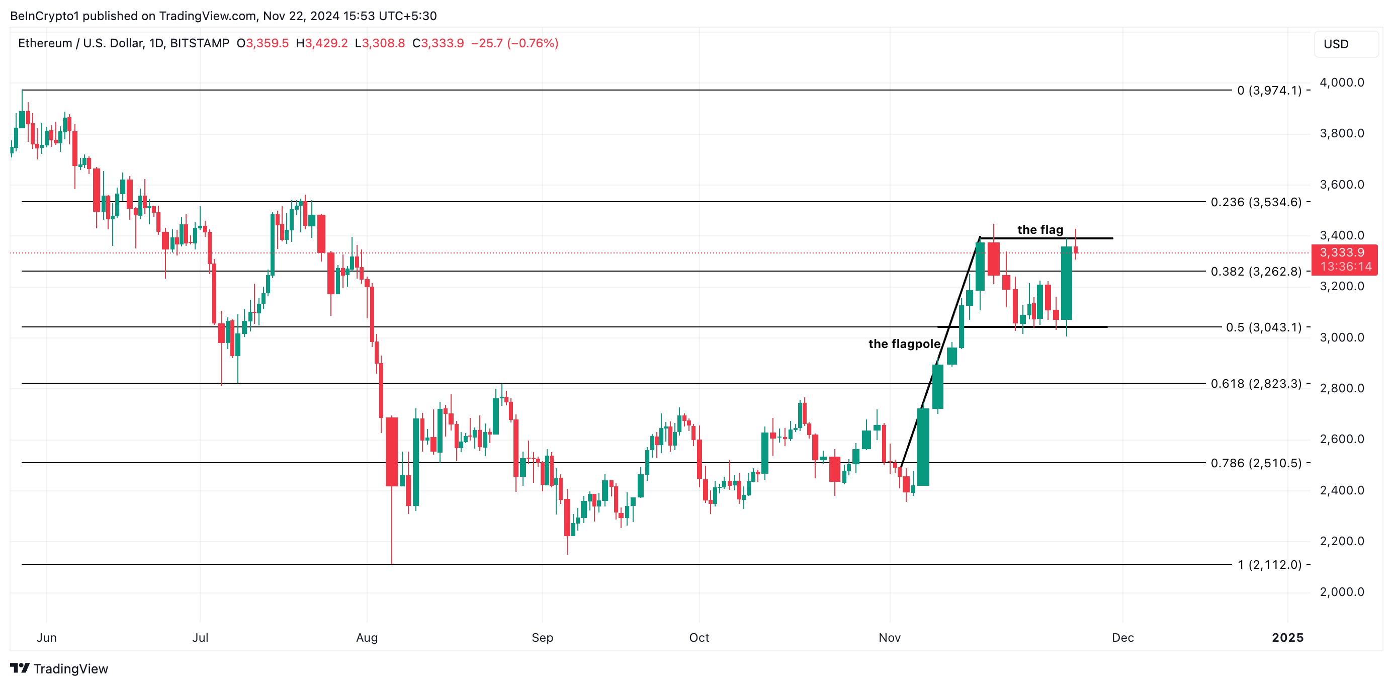 Interesante, ang pagsusuri sa ETH/USD one-day chart ay nagpakita na maaaring may bull flag na nagaganap. Ang pattern na ito ay madalas na nauuna sa pagpapatuloy ng uptrend.