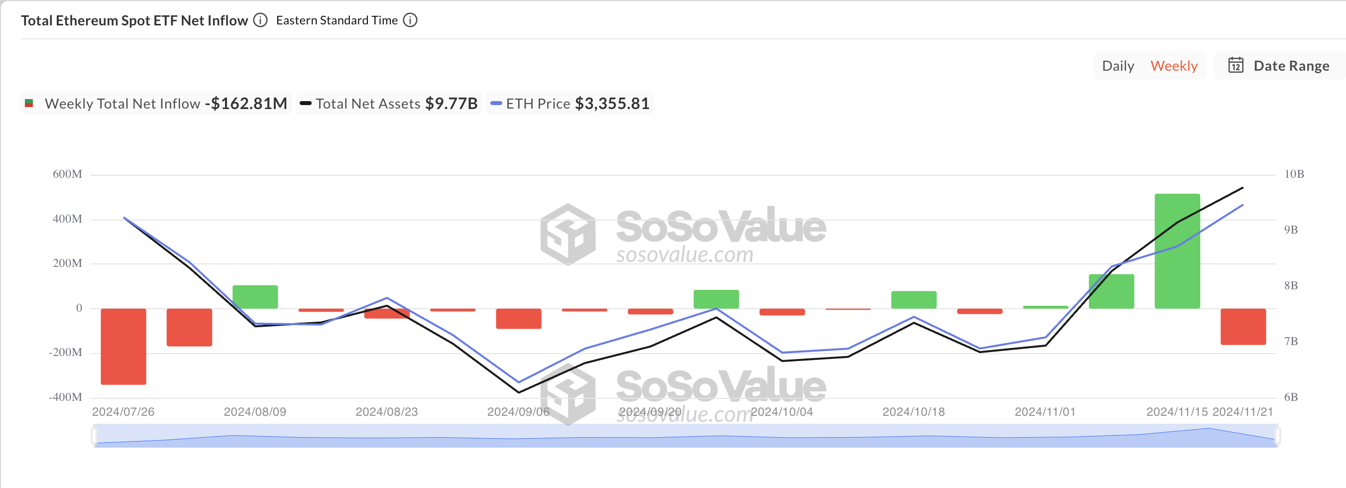 Ayon sa data mula sa SosoValue, umabot sa $163 milyon ang Ethereum ETF outflows ngayong linggo. Ito ang pangatlo sa pinakamataas na weekly net outflows mula nang maging tradeable ang mga pondo noong Hulyo 23.