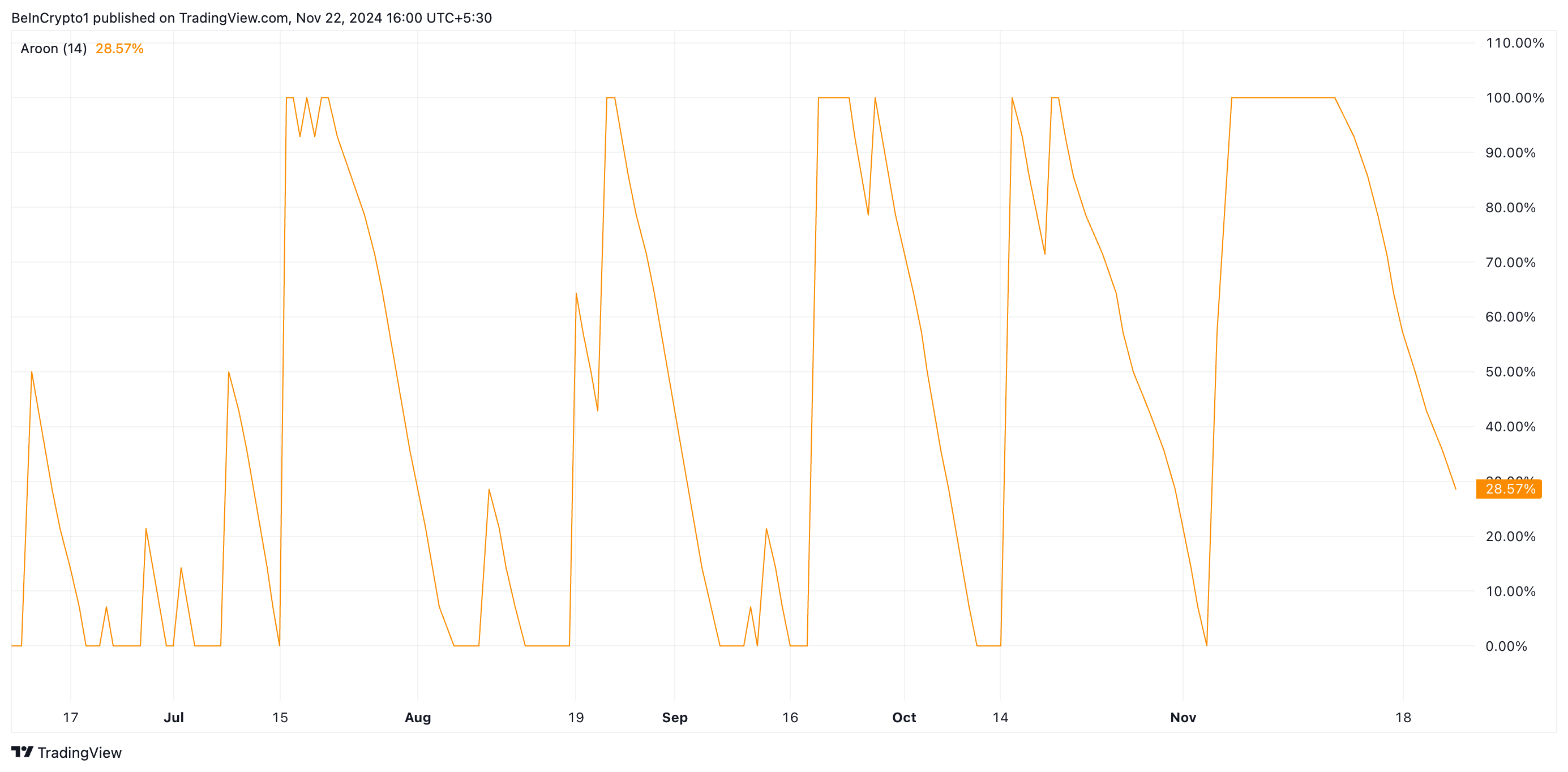 Kapag bumabagsak ang Aroon Up Line, ito ay senyales ng paghina ng uptrend o posibilidad ng trend reversal. Nangyayari ito kapag mas matagal bago maabot ng presyo ang mga bagong highs, na nagpapahiwatig ng pagkawala ng momentum. Ang pagbagsak ng Aroon Up line ay itinuturing na bearish signal, na nagmumungkahi na humihina ang bullish momentum at maaaring magsimula ang downtrend.