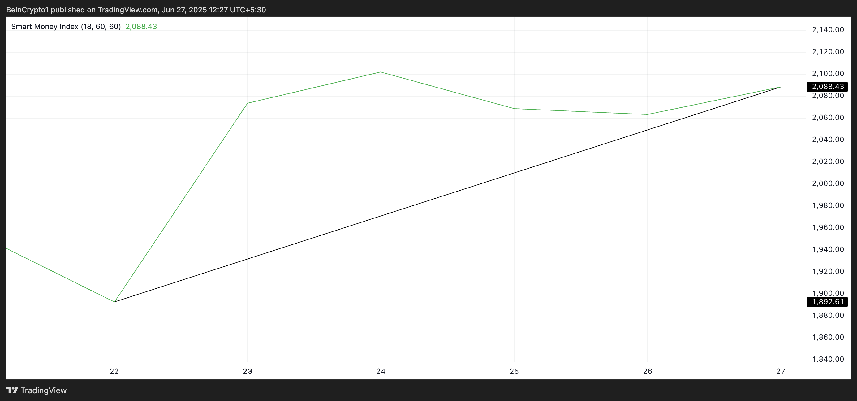 Dagdag pa rito, ang Smart Money Index (SMI) ng ETH ay tumaas ngayong linggo, na kinukumpirma ang pagtaas ng bullish bias sa nangungunang altcoin. Sa ngayon, ang indicator na ito, na sumusubaybay sa trading activity ng mga pangunahing market participants, ay nasa 2,088, tumaas ng 1% mula noong Lunes.