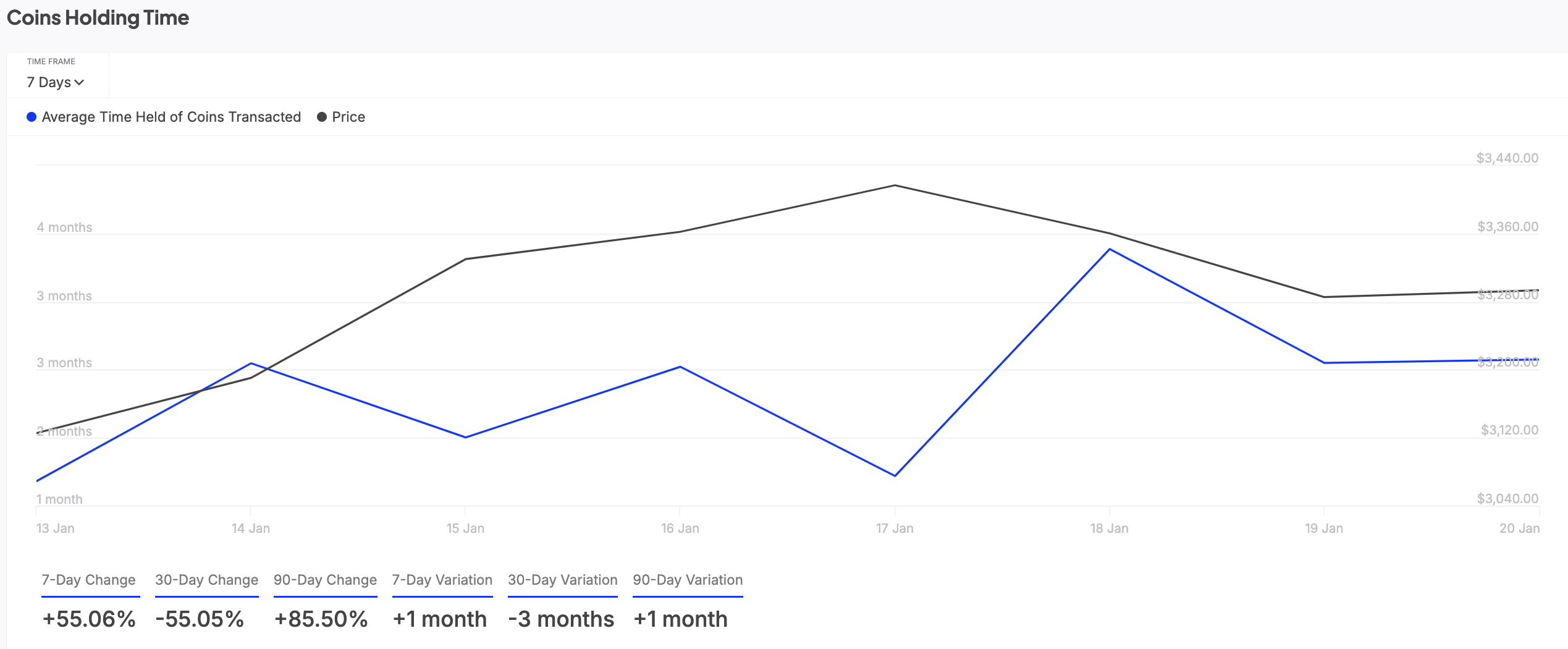 Ipinapakita ng on-chain data na tumaas ang holding time ng lahat ng ETH coins na na-transact sa nakaraang pitong araw. Ayon sa IntoTheBlock, tumaas ito ng 55% sa review period.