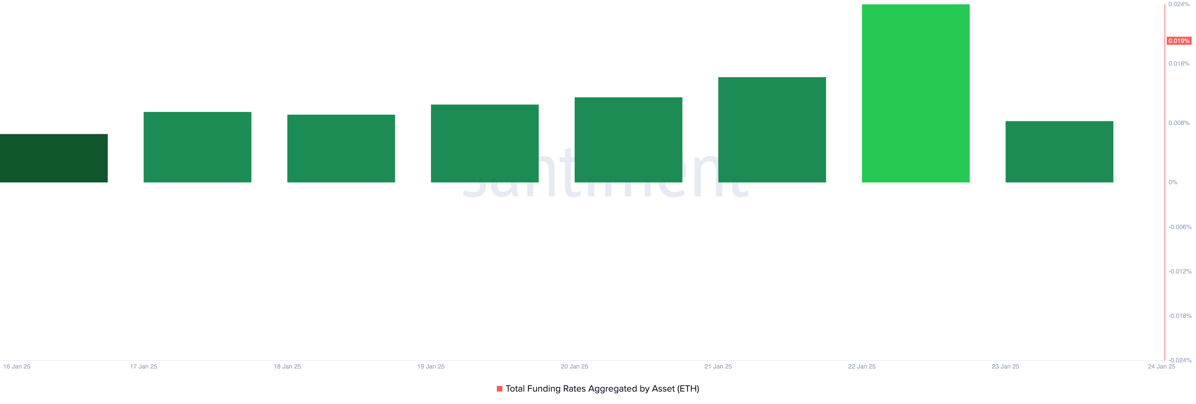 Dagdag pa, ang funding rate ng ETH ay nananatiling positibo kahit na nasa range-bound ang price movements nito sa mga nakaraang linggo. Sa oras ng pag-publish, ito ay nasa 0.019%, na nagpapakita ng steady demand para sa long positions sa mga futures trader ng ETH.