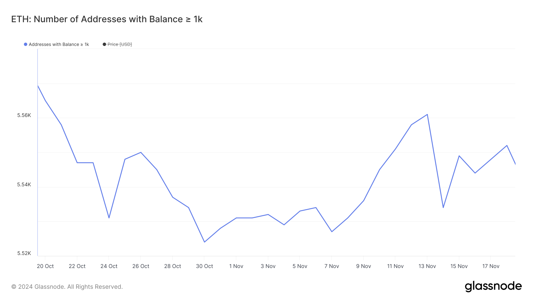 Ang bilang ng Ethereum whales na may hawak na hindi bababa sa 1,000 ETH ay tumaas nang malaki mula Nobyembre 7 hanggang Nobyembre 13, mula 5,527 hanggang 5,561. Ito ay nagmarka ng malakas na panahon ng akumulasyon ng malalaking holders, na nagpapahiwatig ng mas mataas na interes sa panahong iyon.