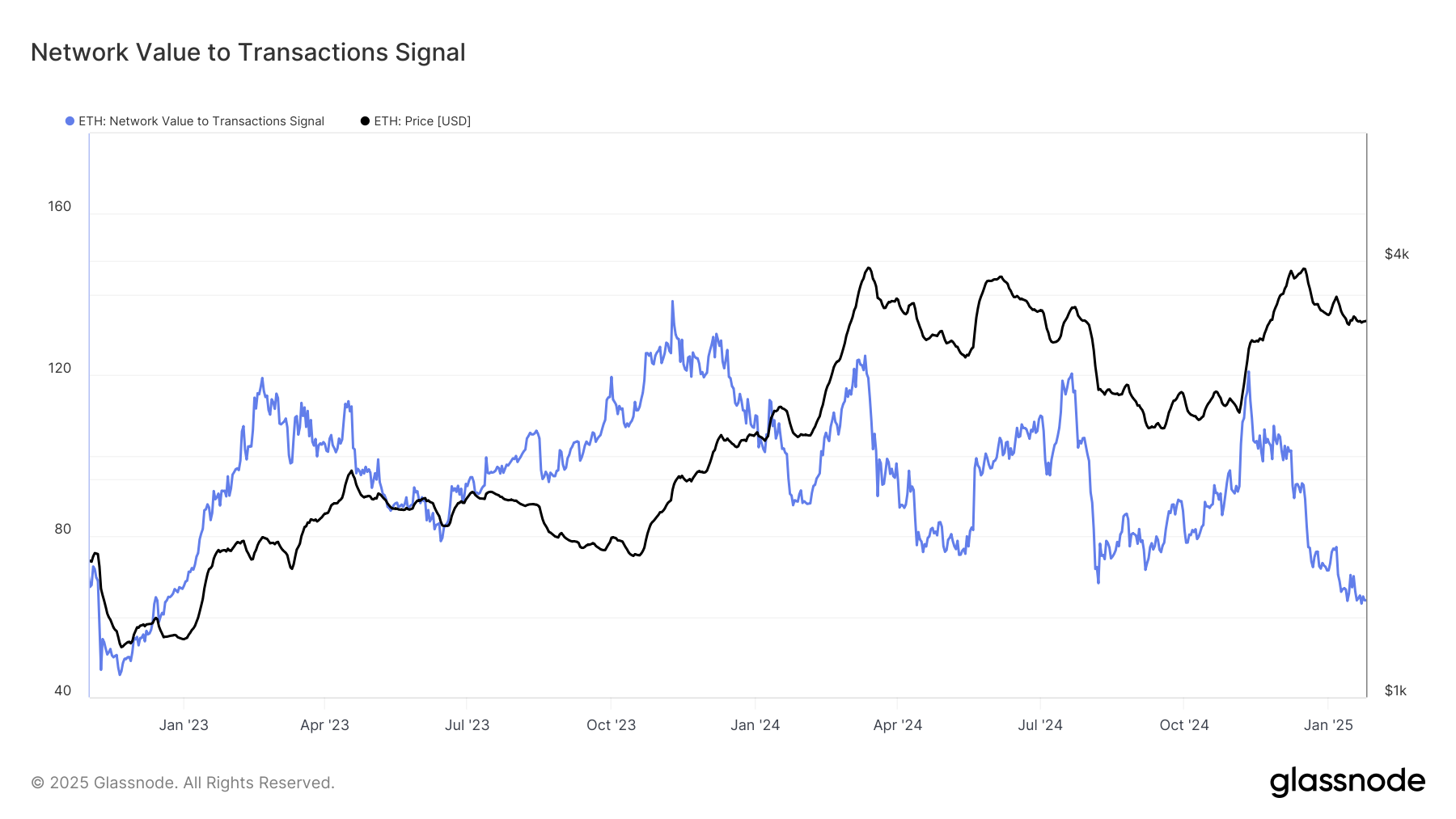 Ang macro momentum ng Ethereum ay nagpapakita ng mixed outlook. Ang Network Value to Transaction (NVT) signal, isang mahalagang metric para sa pag-assess ng valuation, ay bumagsak sa 25-buwan na low. Ipinapakita nito na undervalued ang Ethereum ngayon, na historically ay nagsa-suggest ng potential para sa recovery at rally sa medium to long term.