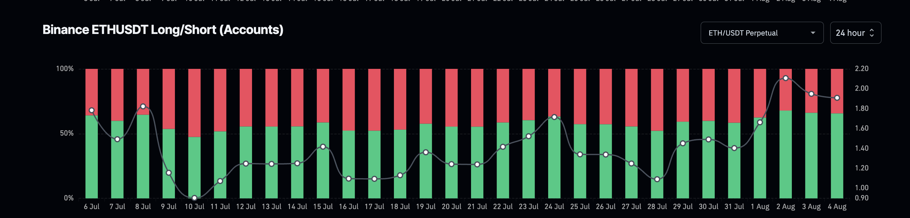 Kahit na may sideways action at madalas na dips, hindi pa rin nagiging bearish ang mga trader. Ayon sa long-short account ratio ng Binance, nasa 1.91 ang metric ng Ethereum, ibig sabihin halos doble ang dami ng long accounts kumpara sa short ones.