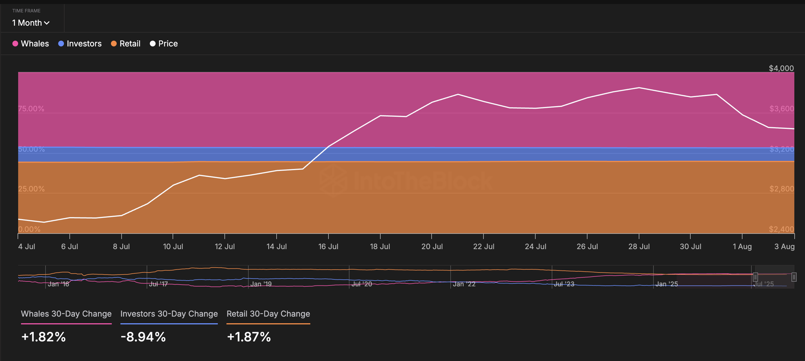 Ang unang signal ay galing sa Ethereum’s on-chain concentration metrics. Sa nakaraang 30 araw, tumaas ng 1.82% ang hawak ng mga whale, habang ang mga retail wallets (mga maliliit na holder) ay tumaas ng 1.87%. Kadalasan, ang galaw ng mga whale ay mas malaki ang epekto kumpara sa mga investor at retail movements dahil sa laki ng trading nila.