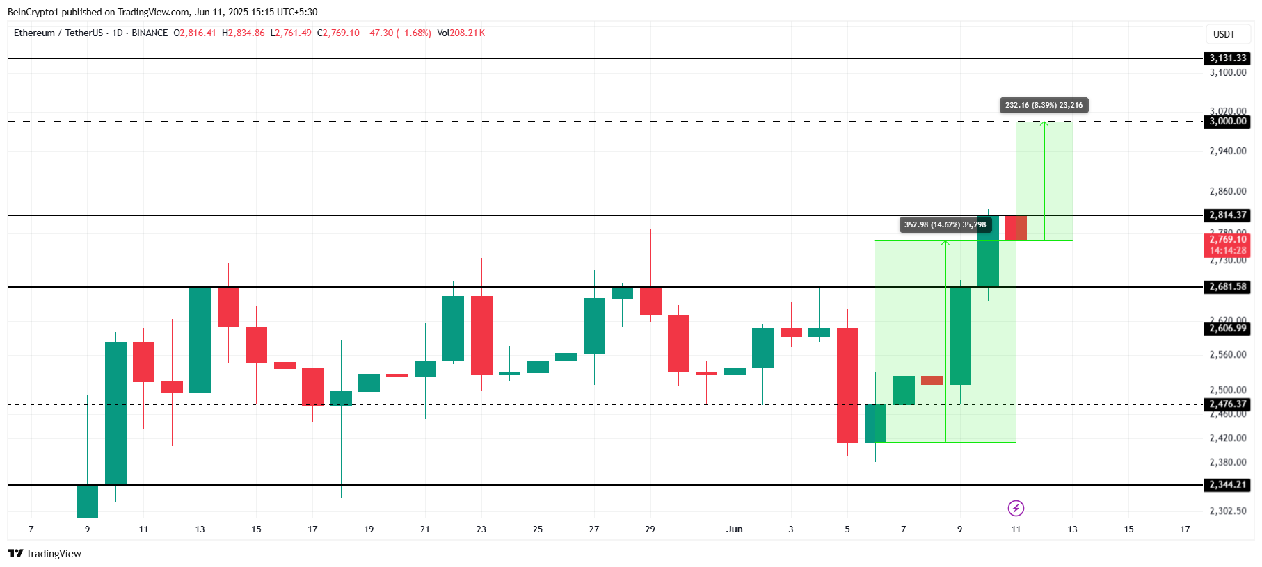 Ang presyo ng Ethereum ay kasalukuyang nasa $2,769, tumaas ng 14.6% ngayong linggo matapos makawala sa month-long consolidation sa ilalim ng $2,681. Ngayon, ang ETH ay humaharap sa resistance sa $2,814.
