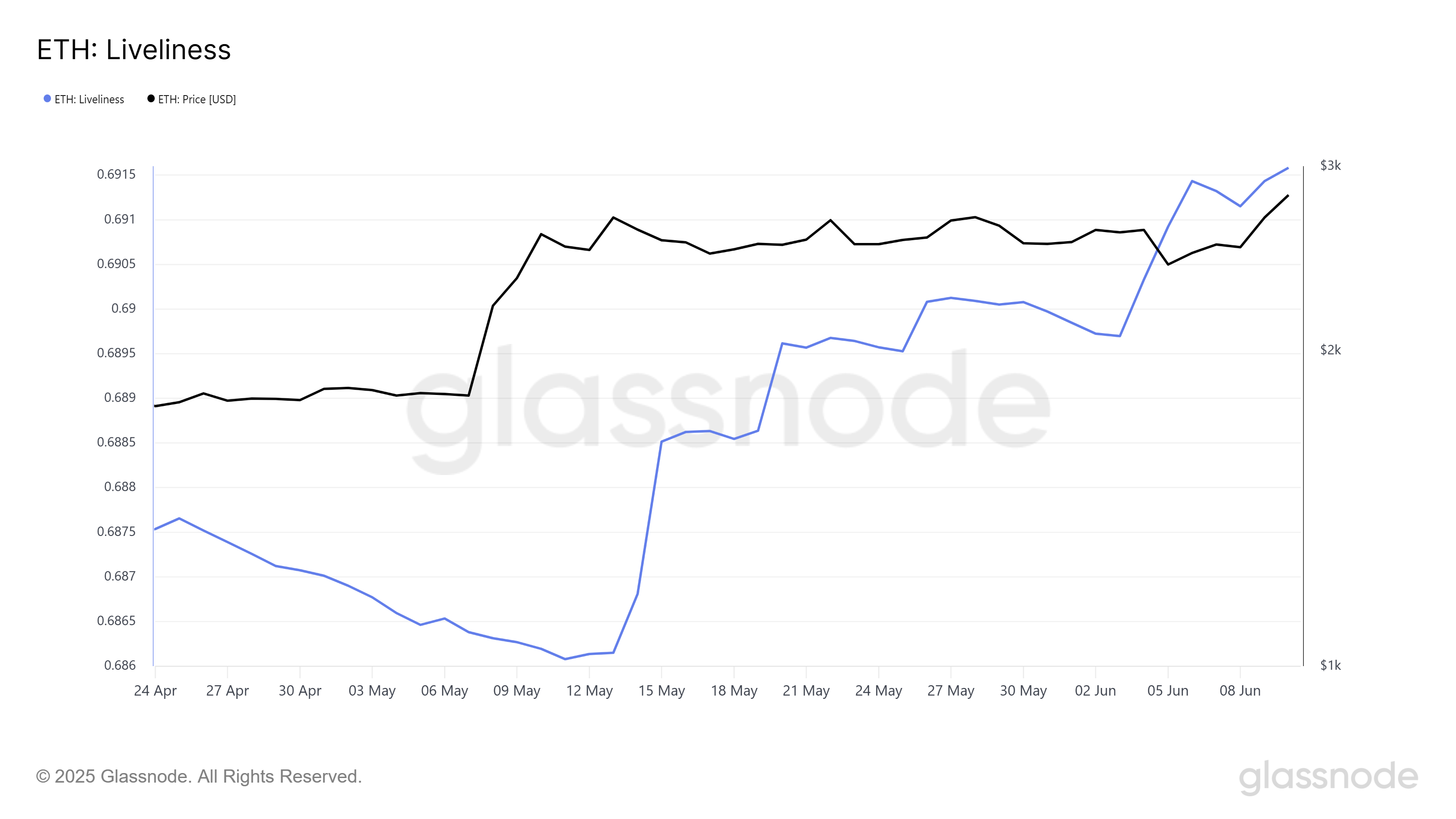 Patuloy na tumataas ang Liveliness metric ngayong linggo, na nagpapakita na mas maraming long-term holders (LTHs) ang nagli-liquidate ng kanilang holdings. Ang Liveliness ay sumusukat kung gaano kadalas naiaalis ang mga coins mula sa wallets, at ang pagtaas ng metric na ito ay nagpapahiwatig ng selling pressure.