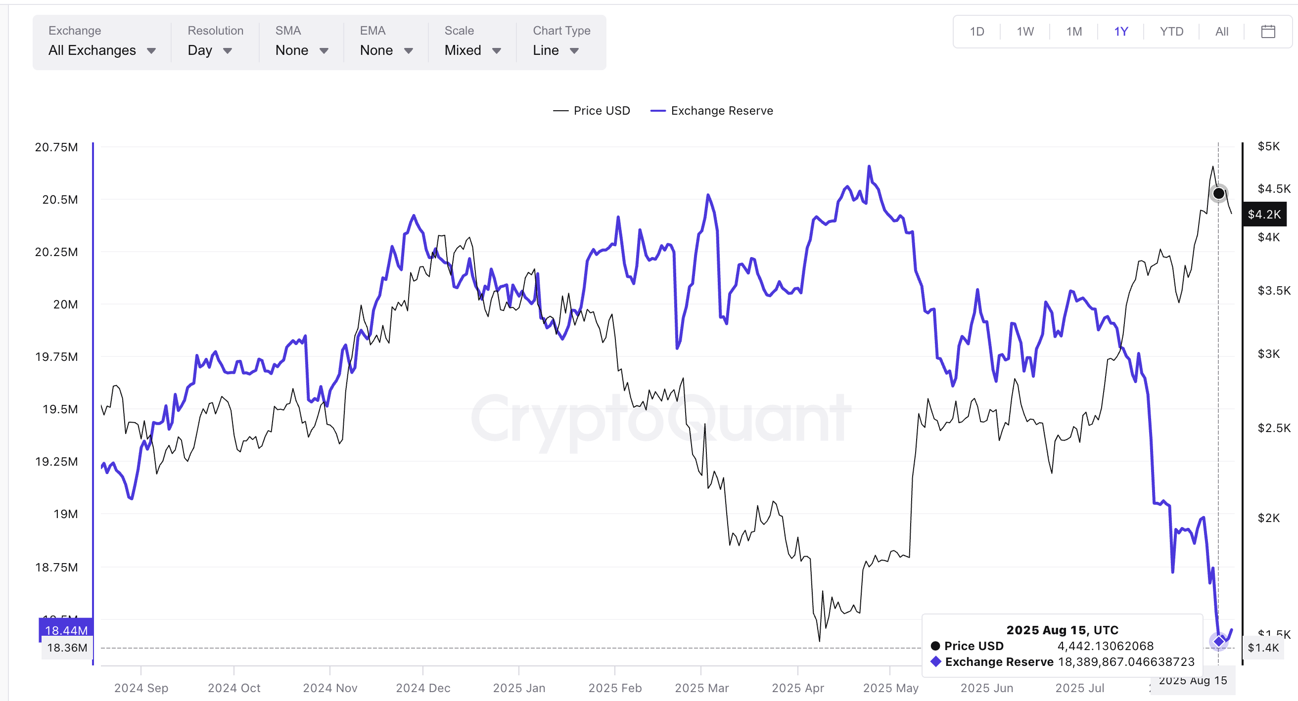 Sa parehong oras, ang reserves ng Ethereum sa mga exchange ay nananatiling nasa 9-year lows. Kahit na may whale-led ETH inflows, bahagya lang gumalaw ang reserves mula 18.389 million ETH noong August 15 hanggang 18.404 million ETH sa kasalukuyan. Iyan ay sobrang baba pa rin, ibig sabihin patuloy ang bagong pagbili tuwing bumababa ang presyo ng Ethereum.