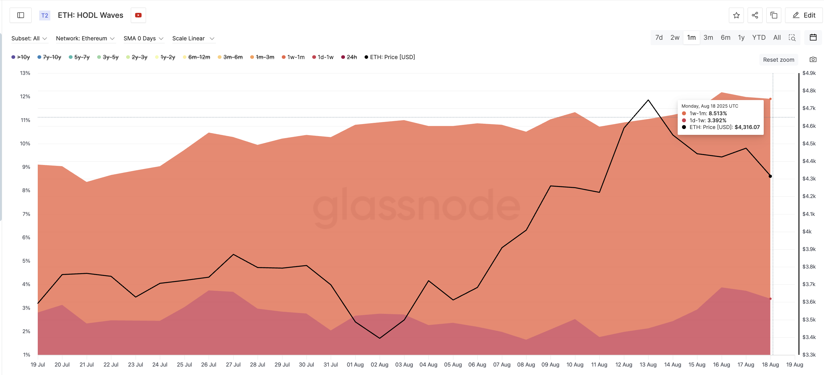 Dalawang key short-term cohorts — mga wallet na may hawak ng ETH mula 1 araw hanggang 1 linggo, at 1 linggo hanggang 1 buwan — ang tumaas ang share ng supply: