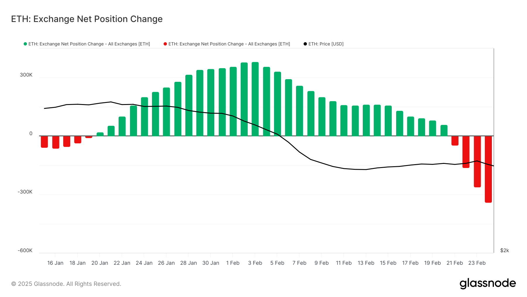 Ang macro momentum ng Ethereum ay nananatiling solid kahit na may mga kamakailang pagbaba ng presyo. Ipinapakita ng exchange net position change ng Ethereum ang kapansin-pansing pagbabago, kung saan 178,500 ETH ang lumabas sa exchanges sa nakalipas na 48 oras.