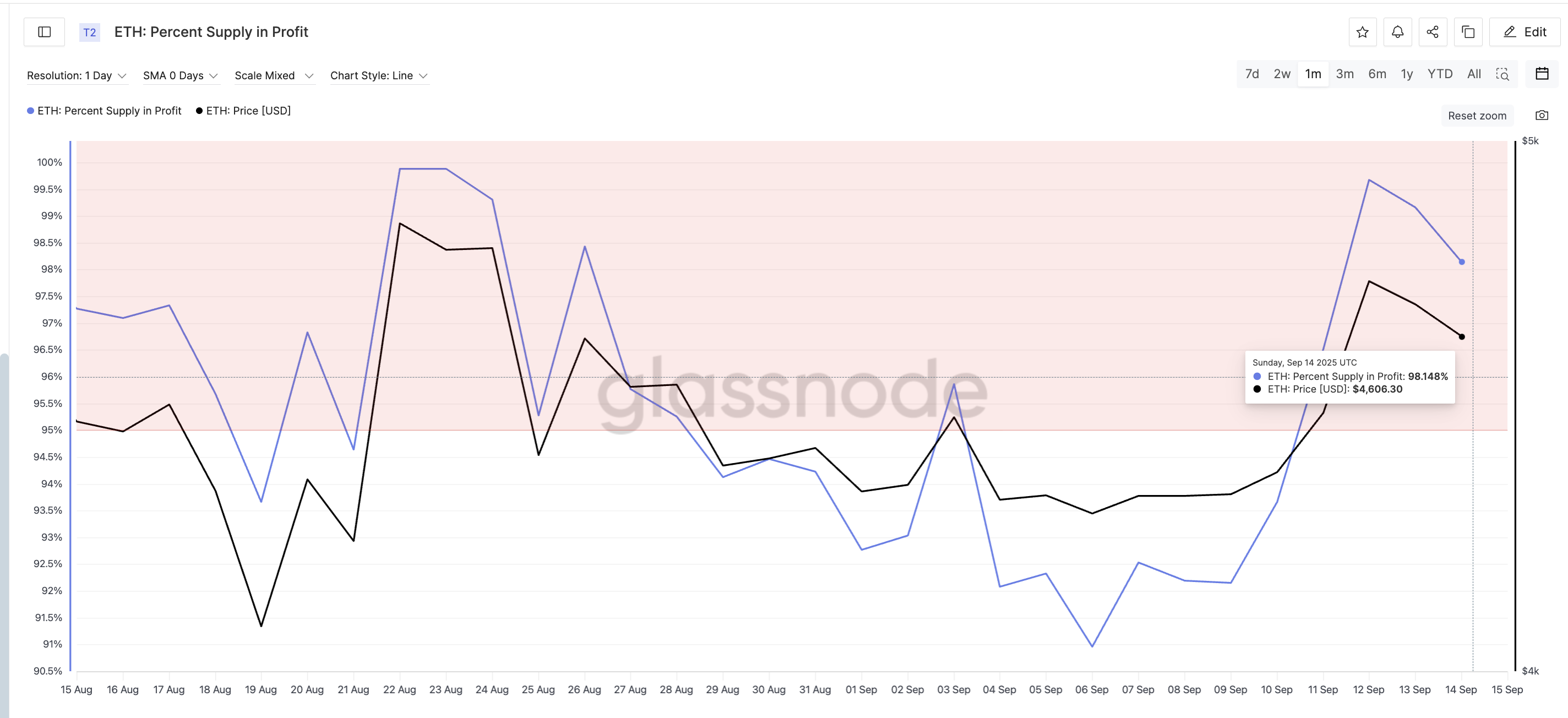 Sa tuwing umaabot ang ETH sa mga local peaks na ito, sumusunod ang mga corrections. Halimbawa, noong Agosto 22, umabot ang profit supply sa 99.88% nang ang ETH ay nasa $4,829. Ilang araw lang, bumagsak ang presyo ng Ethereum sa $4,380, isang pagbaba ng halos 9%.