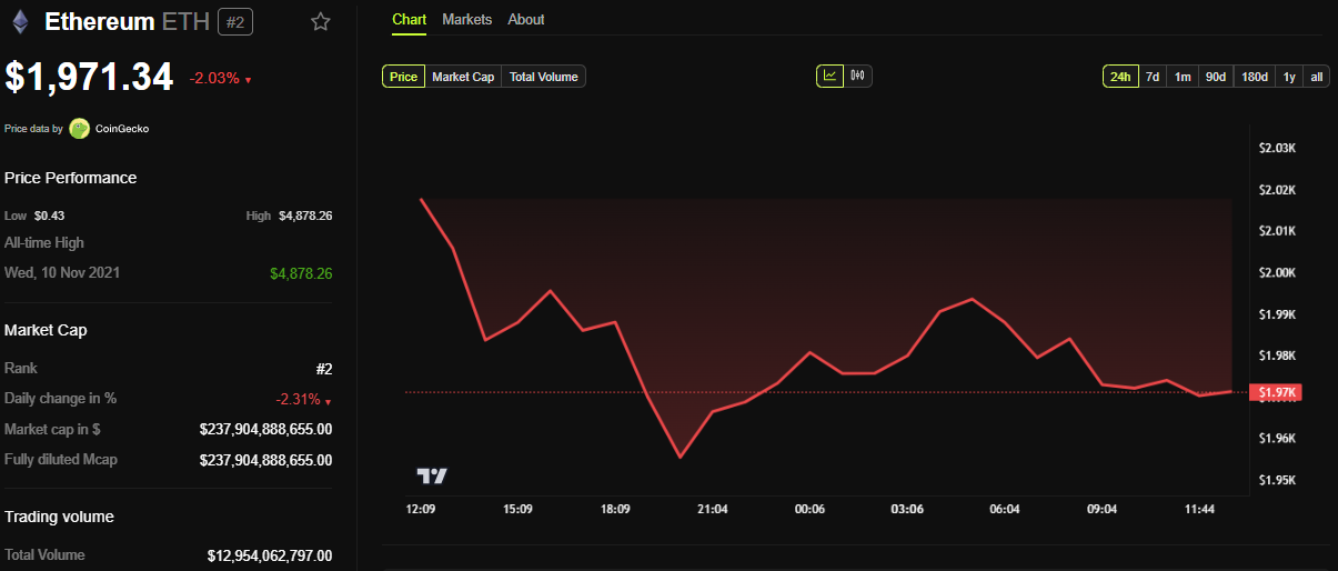 Ayon sa data ng BeInCrypto, ang ETH ay nagte-trade sa halagang $1,971 sa ngayon, bumaba ng mahigit 2% sa nakalipas na 24 oras.