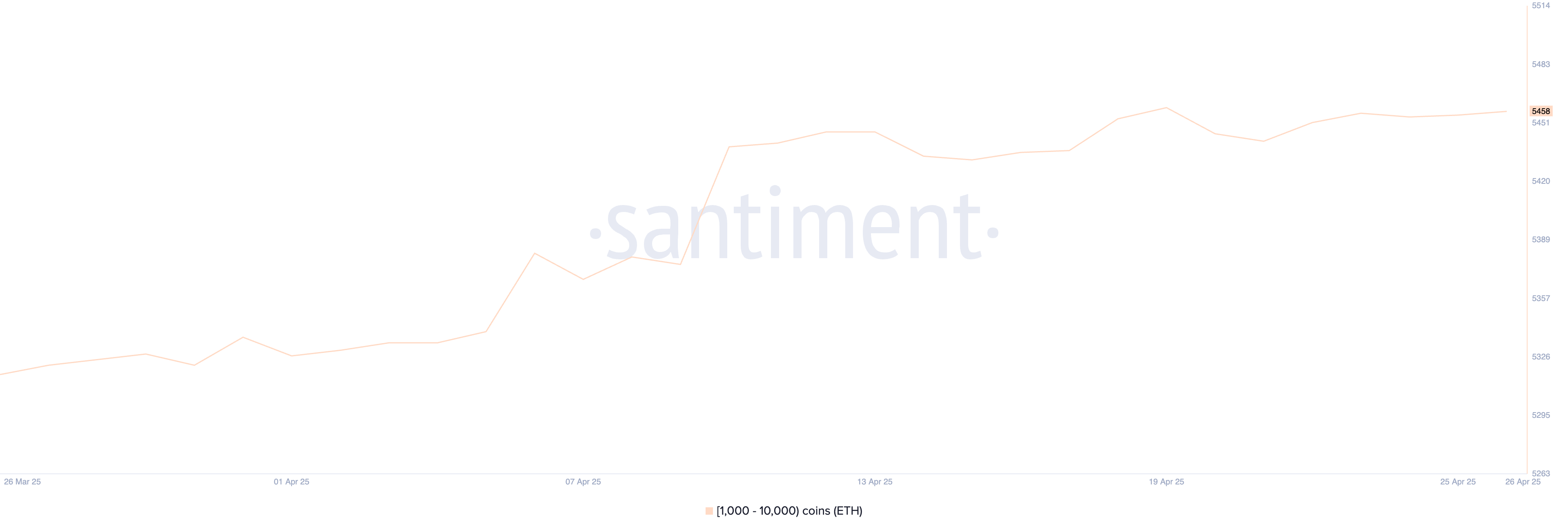 Ang bilang ng Ethereum whales — mga wallet na may hawak na 1,000 hanggang 10,000 ETH — ay nasa 5,458 ngayon.