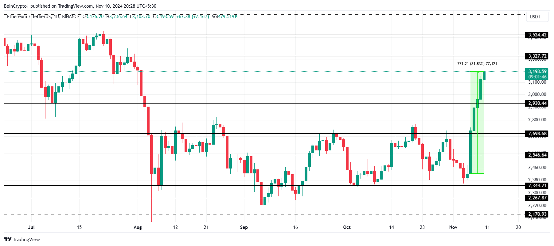 Ang presyo ng Ethereum ay tumaas ng 31.8% sa nakaraang limang araw, at kasulukuyang trading sa $3,193. Ang next resistance level para sa Ethereum ay $3,327, na kailangan nitong ma-break para mapanatili ang upward momentum. Ang paglampas sa resistance na ito ay magpapakita ng renewed strength sa market at magse-set up sa Ethereum sa mas malaking gains.