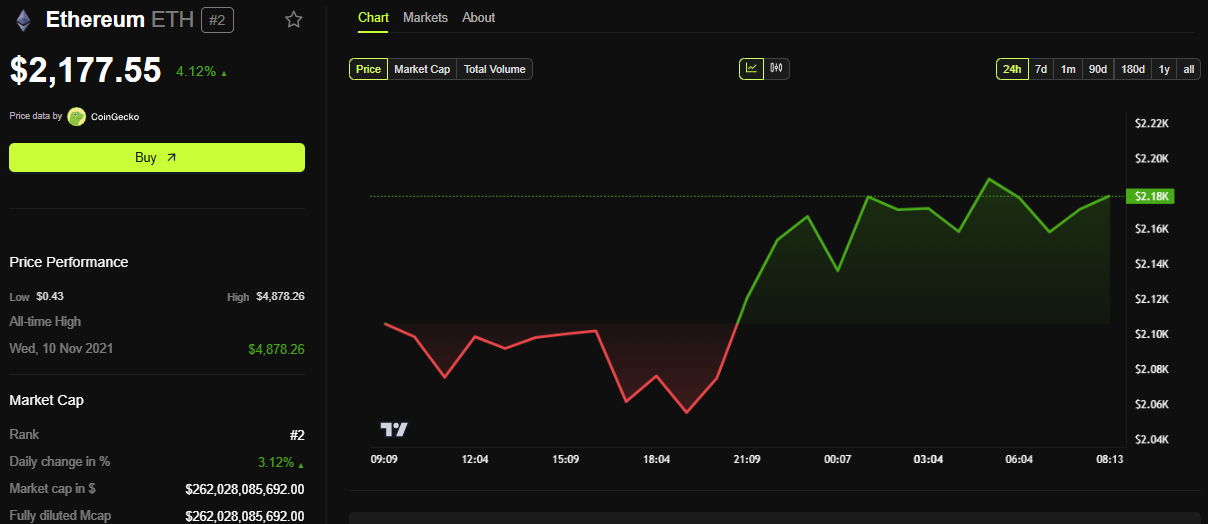 Ayon sa BeInCrypto data, nagpakita na tumaas ang presyo ng Ethereum ng mahigit 4% sa nakalipas na 24 oras. Sa kasalukuyan, ang ETH ay nagte-trade sa halagang $2,177.