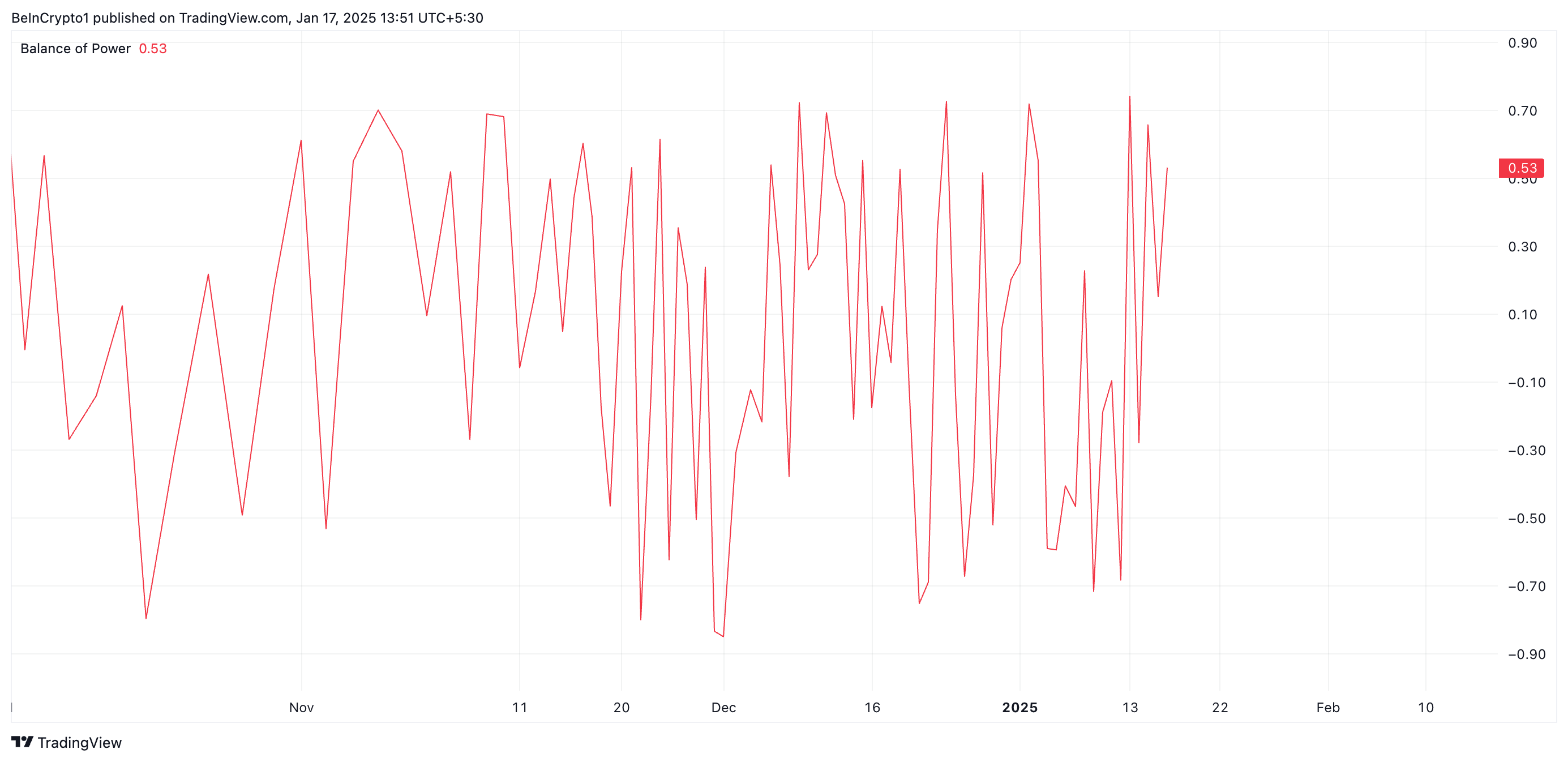 Ang Balance of Power (BoP) ng FARTCOIN ay nagpapakita ng bullish bias na kasalukuyang tinatamasa ng meme coin. Sa oras ng pagsulat, ang indicator na ito ay nasa upward trend na 0.53.