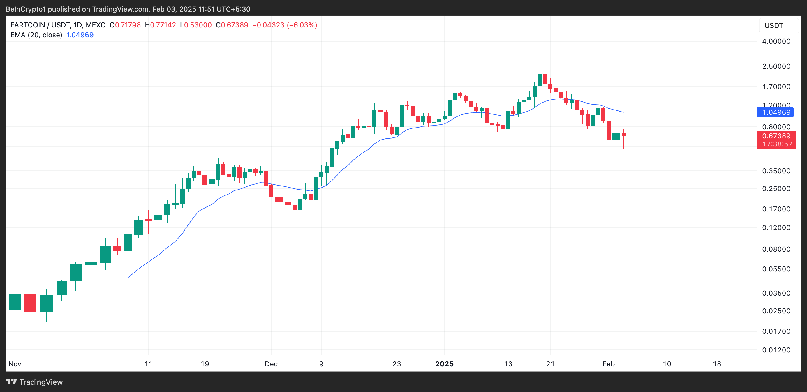 Ang 20-day EMA ng isang asset ay sumusukat sa average trading price nito sa nakaraang 20 araw, na nagbibigay ng mas malaking timbang sa mga kamakailang presyo para mas maipakita ang short-term trends. Kapag bumaba ang presyo ng isang asset sa ilalim ng key moving average na ito, senyales ito ng humihinang momentum at bearish shift. Ibig sabihin, tumataas ang selling pressure ng FARTCOIN, at kung hindi tataas ang demand, maaaring magpatuloy ang pagbaba ng asset.