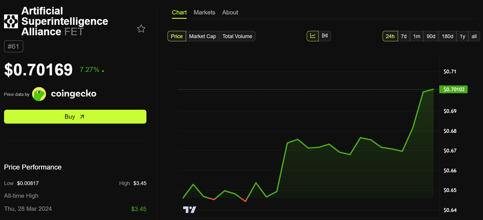 Ang token ng Artificial Superintelligence Alliance, FET, ay tumaas ng mahigit 7% at nagte-trade sa halagang $0.7017 sa kasalukuyan. Sa pagtaas na ito, in-overtake ng FET ang top 30 AI crypto tokens na niraranggo base sa market cap metrics.