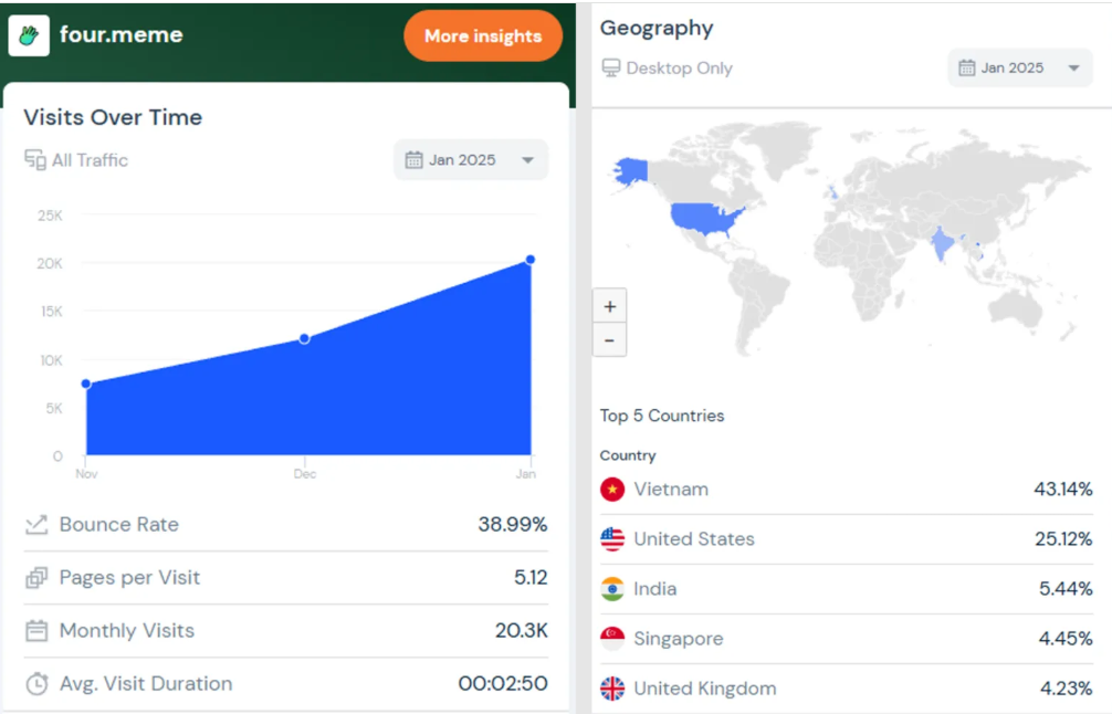 Samantala, ipinapakita ng SimilarWeb data na ang traffic ng platform ay triple sa nakaraang 3 buwan, mula 7,000 hanggang mahigit 20,000. Interestingly, ang mga Vietnamese investors ay kasalukuyang nag-aaccount para sa higit sa 43% ng traffic ng Four.Meme, kasunod ang US.