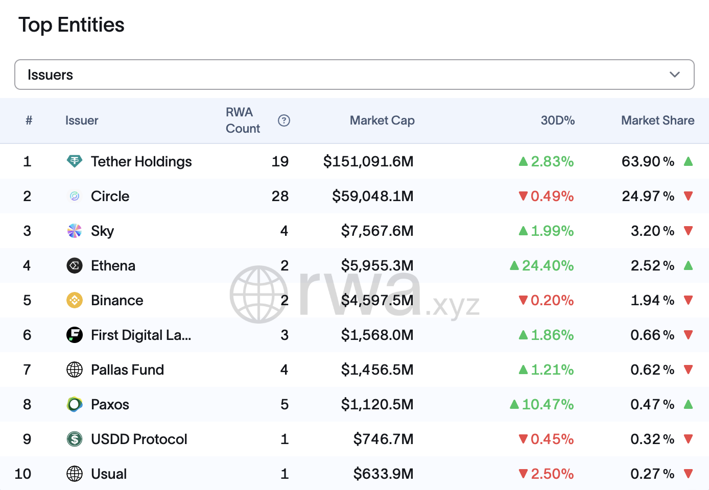 Tether at Circle ang nangunguna sa market na may $151 billion at $59 billion, ayon sa pagkakasunod. Magkasama, hawak nila ang 89% market share, ayon sa rwa.xyz.