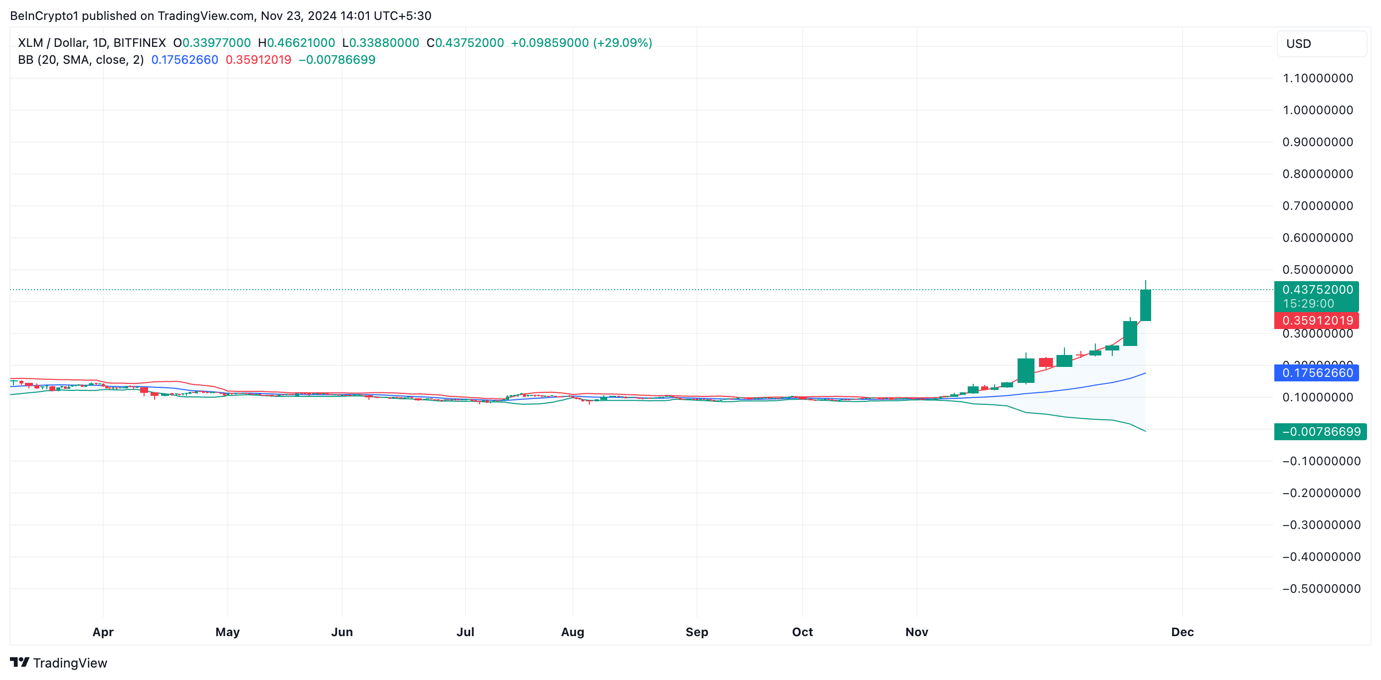 Ang positibong damdamin sa filing na ito ay nagresulta sa pagtaas ng halaga ng XLM. Sa nakaraang 24 oras, ang presyo ng token ay tumaas ng 58%, kaya ito ang nangungunang gainer sa market. Sa ngayon, ang altcoin ay nasa $0.45, isang presyo na huling nakita noong Nobyembre 2021.