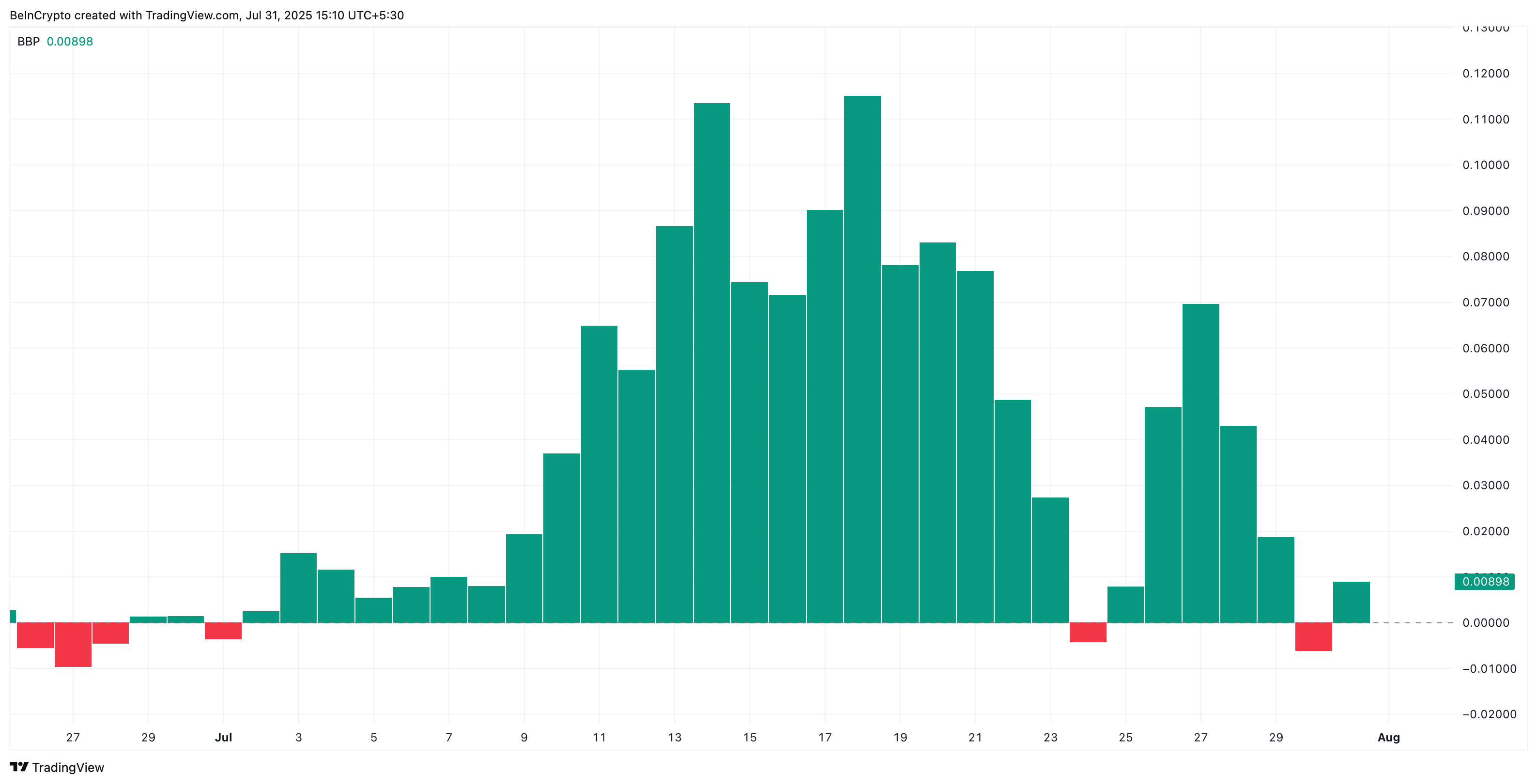 Ang Bull-Bear Power (BBP) indicator, na sumusukat kung alin sa bulls o bears ang may mas malakas na momentum, ay sandaling naging negative sa isang session noong nakaraang linggo pero mabilis na bumalik sa green.