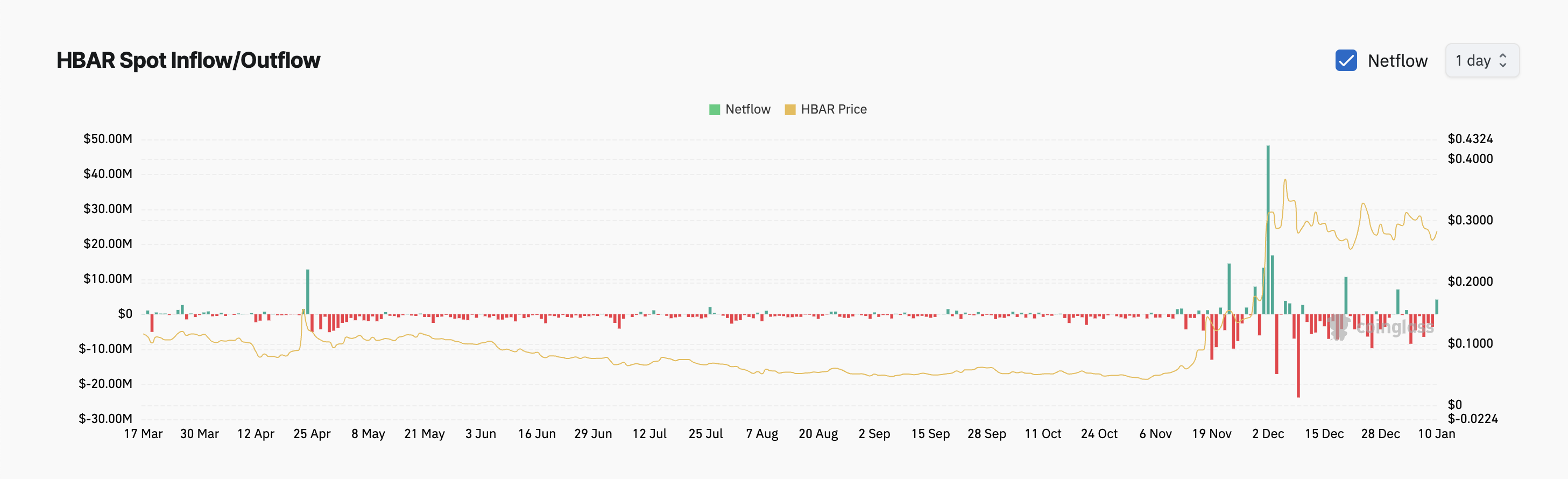 Ang HBAR, ang native token na nagpapatakbo sa Hedera Hashgraph distributed ledger, ay nakapagtala ng unang spot inflows nito nitong nakaraang linggo, na umabot sa $4 million. Dahil dito, may mga haka-haka na baka ito na ang pagkakataon ng altcoin na maka-break sa makitid na range na kinabibilangan nito simula pa noong early December.