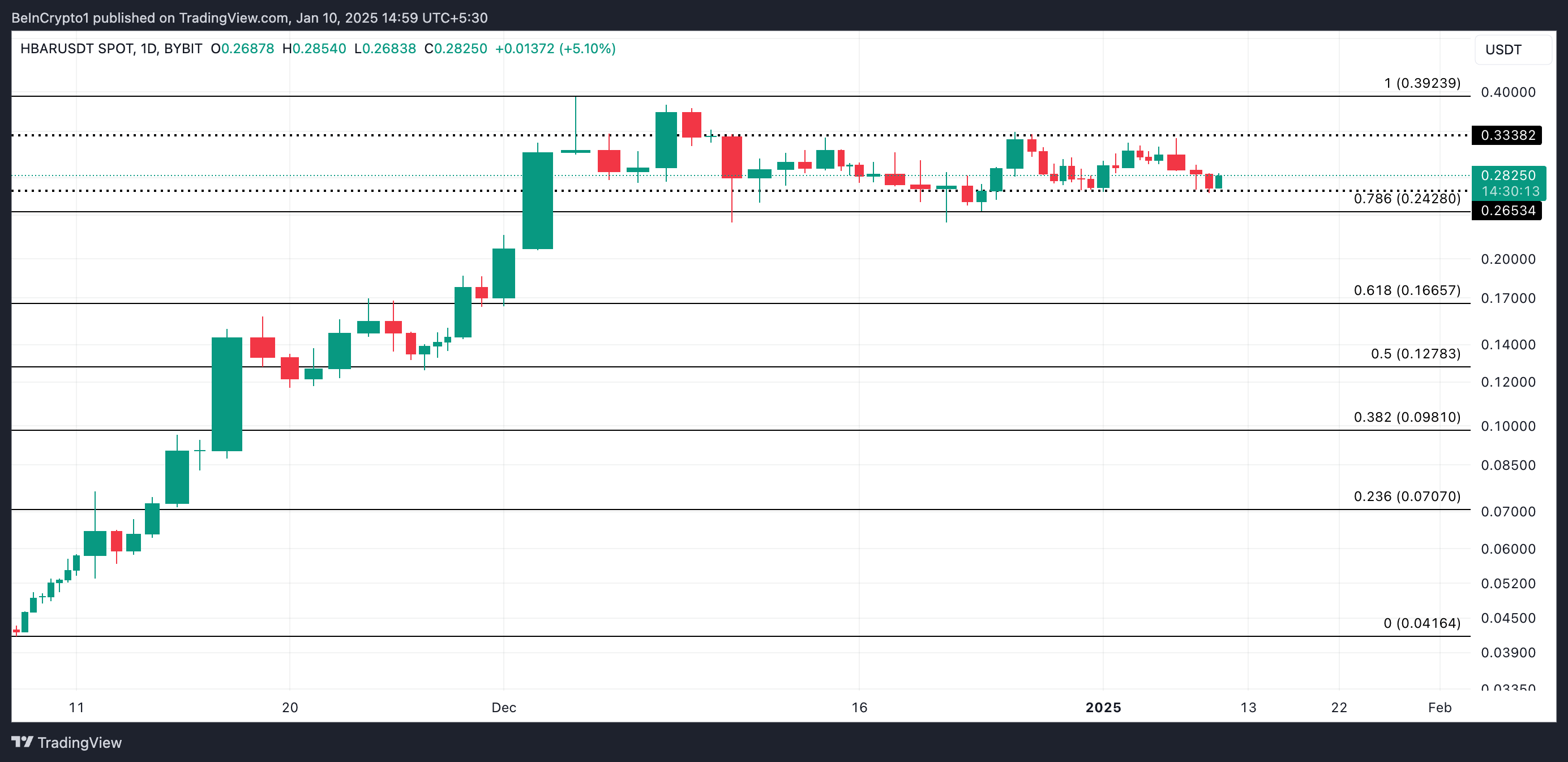Simula noong December 4, ang presyo ng HBAR ay nag-o-oscillate sa isang price range. Nakaharap ito ng resistance sa $0.33 at nakahanap ng support sa $0.24. Sa kasalukuyan, ang altcoin ay nagte-trade lang sa itaas ng support level na ito sa $0.28.