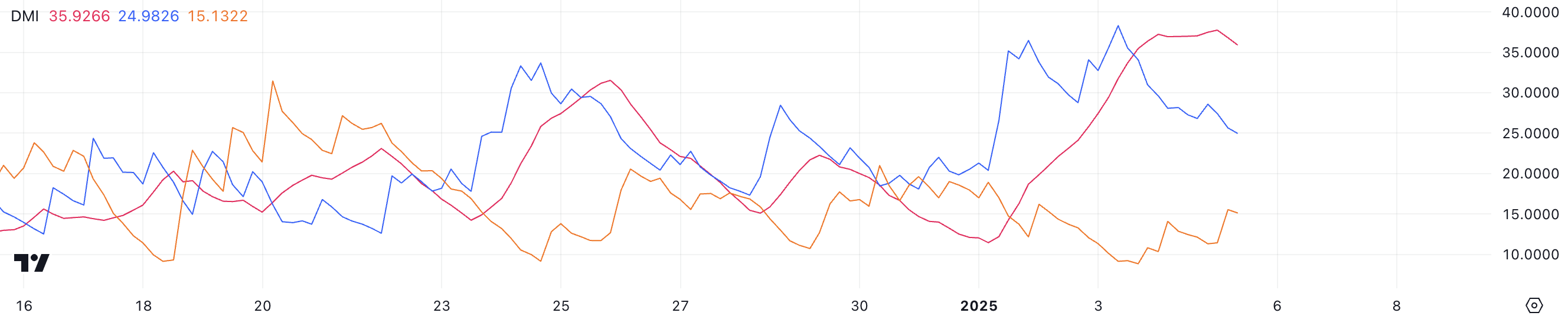 Ang Average Directional Index (ADX) para sa Hedera ay nasa 35.9 ngayon, na nagpapakita ng malakas na trend strength, kahit na bahagyang bumaba mula sa 37.7 ilang oras na ang nakalipas. Ang ADX ay sumusukat sa lakas ng trend sa scale na 0 hanggang 100, kung saan ang mga value na higit sa 25 ay nagpapahiwatig ng malakas na trend at ang mga value na mas mababa sa 20 ay nagpapahiwatig ng mahina o walang momentum.