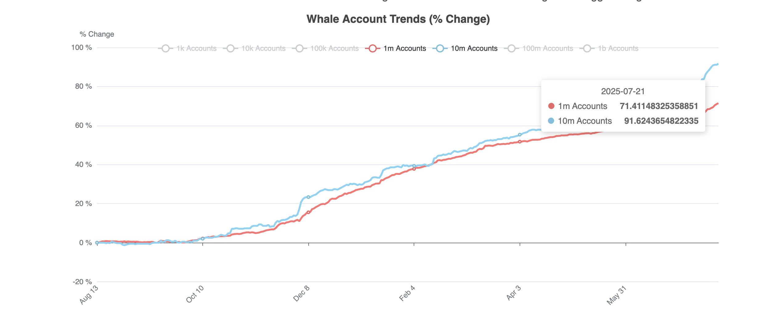Patuloy ang pag-accumulate ng mga whale wallets. Nitong nakaraang linggo, tumaas mula 67.28% hanggang 71.41% ang bilang ng mga wallet na may hawak na 1 milyong HBAR o higit pa. Pati na rin ang mga wallet na may 10 milyon+ HBAR ay tumaas mula 86.29% hanggang 91.62%. Mahigit 5% na pagtaas ito sa loob ng ilang araw lang.