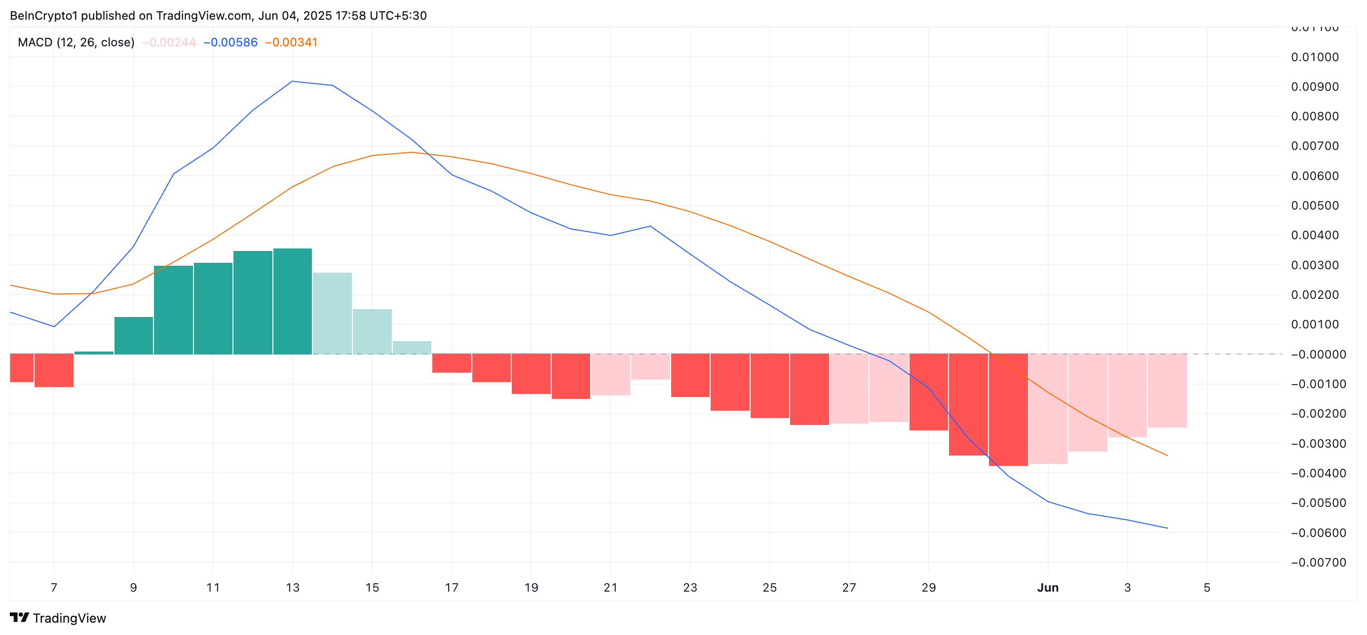 Halimbawa, ang readings mula sa Moving Average Convergence Divergence (MACD) ng HBAR ay nagpapakita na ang MACD line nito (blue) ay nasa ilalim ng signal line (orange) sa ngayon, na nagpapahiwatig ng matinding bearish presence sa merkado.