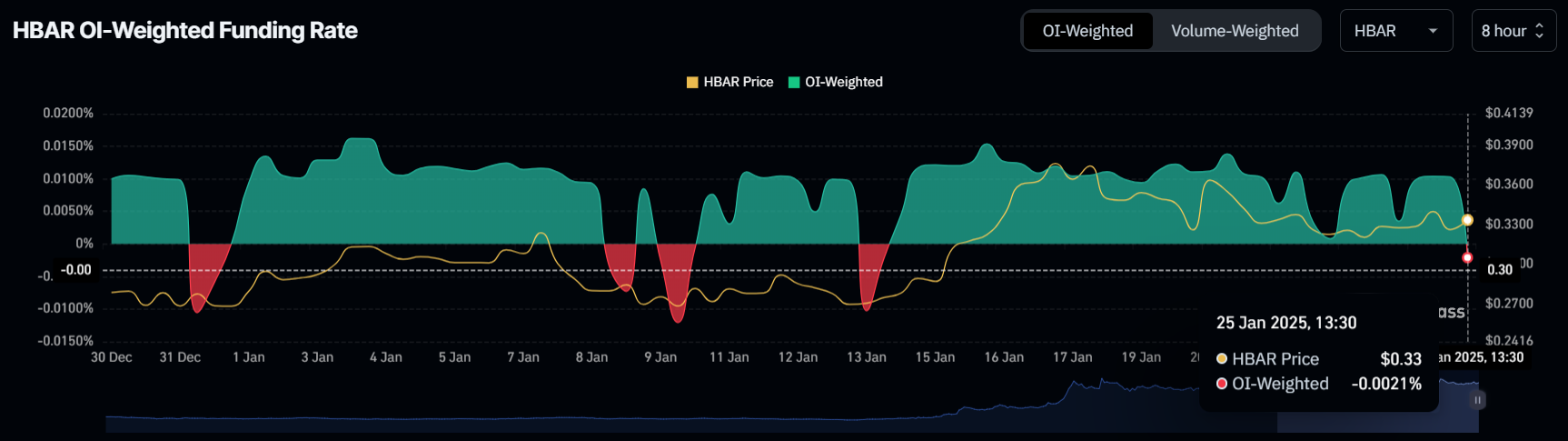 Ang HBAR ay kasalukuyang nagte-trade sa $0.33, na naglalayong gawing support floor ang level na ito. Mahalaga ito para sa token na ma-challenge ang $0.39 resistance level. Ang pag-break sa resistance na ito ay maaaring magbigay-daan sa karagdagang upward movement.