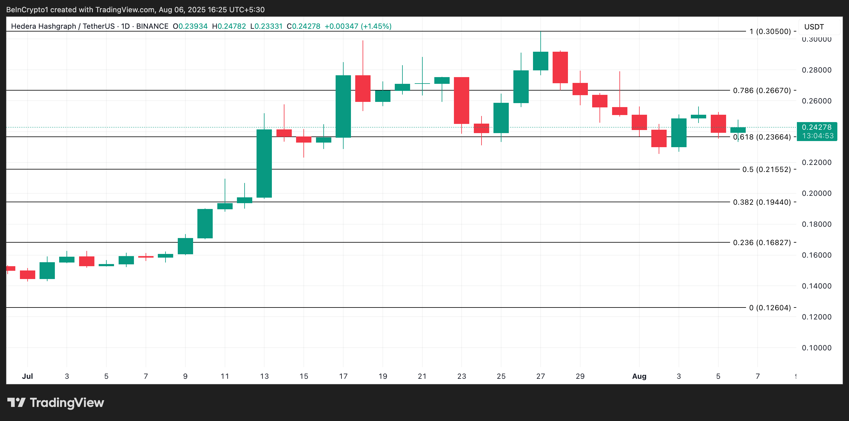 Ang rally ng HBAR, na umabot sa $0.3050 noong July 27, ay nawalan ng momentum. Sa kasalukuyan, nasa $0.2427 ang halaga ng altcoin, at bumaba na ito ng 11%.
