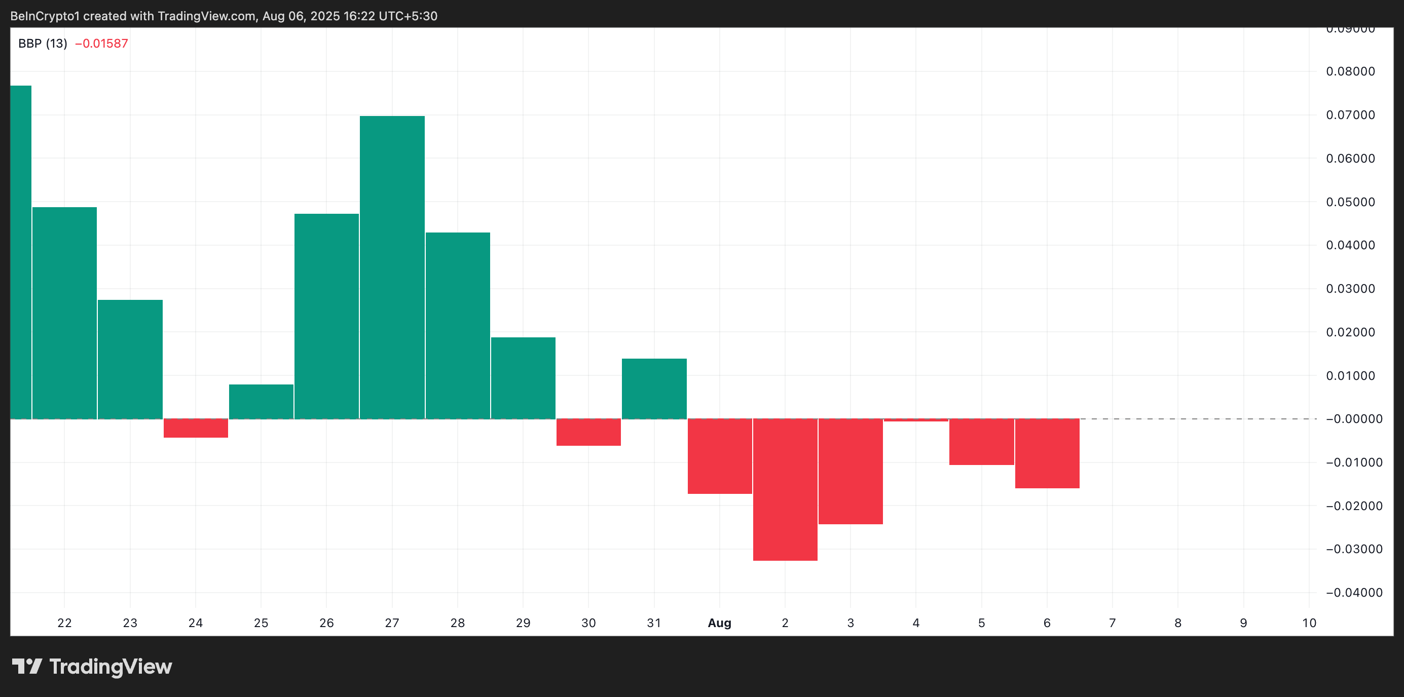 Ang momentum indicator na ito ay sumusukat sa balanse ng buying at selling pressure sa pamamagitan ng pag-compare ng price action laban sa moving average. Ang positive values ay nagpapahiwatig na ang mga buyer ang may kontrol, habang ang negative readings ay nagpapakita na ang mga seller ang may upper hand.