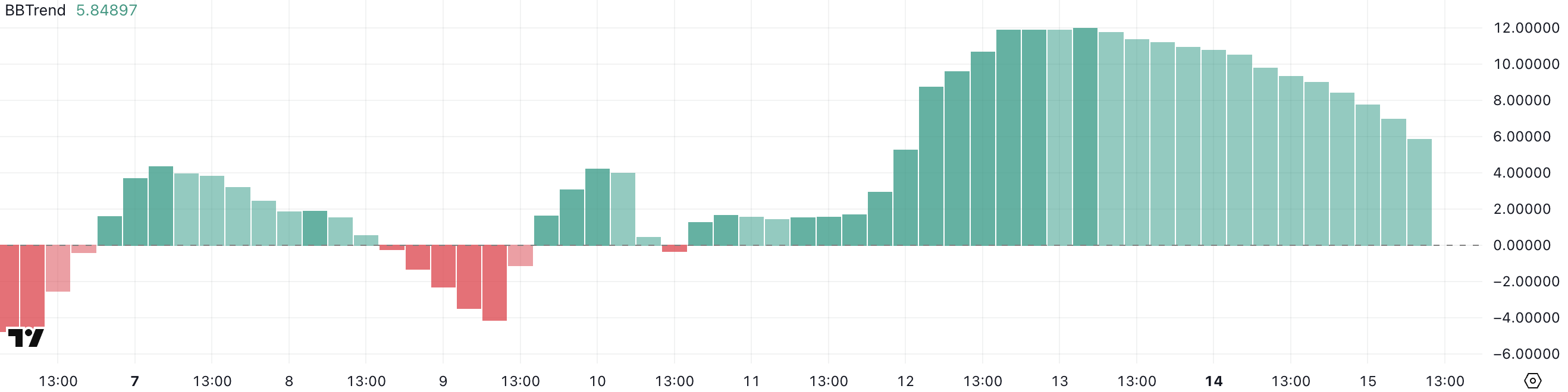 Bumagsak ang BBTrend ng Hedera sa 5.84, mula sa 11.99 dalawang araw lang ang nakalipas. Ang BBTrend, o Bollinger Band Trend indicator, ay sumusukat sa lakas ng isang trend base sa layo ng presyo mula sa average range nito.