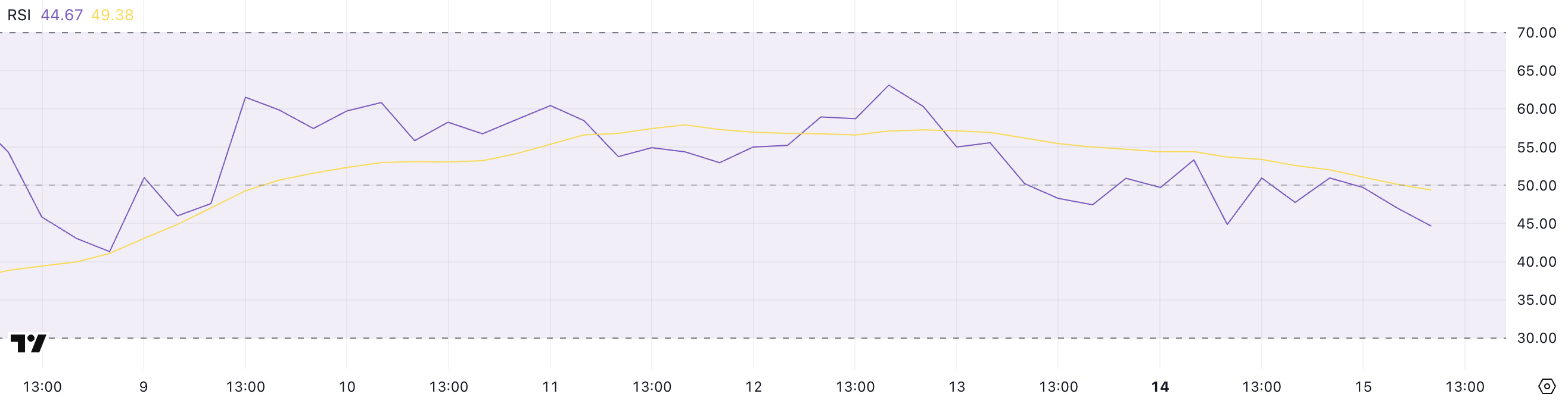 Ang RSI ng Hedera ay kasalukuyang nasa 44.67, bumaba mula sa 63.12 tatlong araw lang ang nakalipas, na nagpapahiwatig ng kapansin-pansing pagkawala ng bullish momentum. Ang Relative Strength Index (RSI) ay isang momentum oscillator na sumusukat sa bilis at laki ng mga kamakailang pagbabago sa presyo.