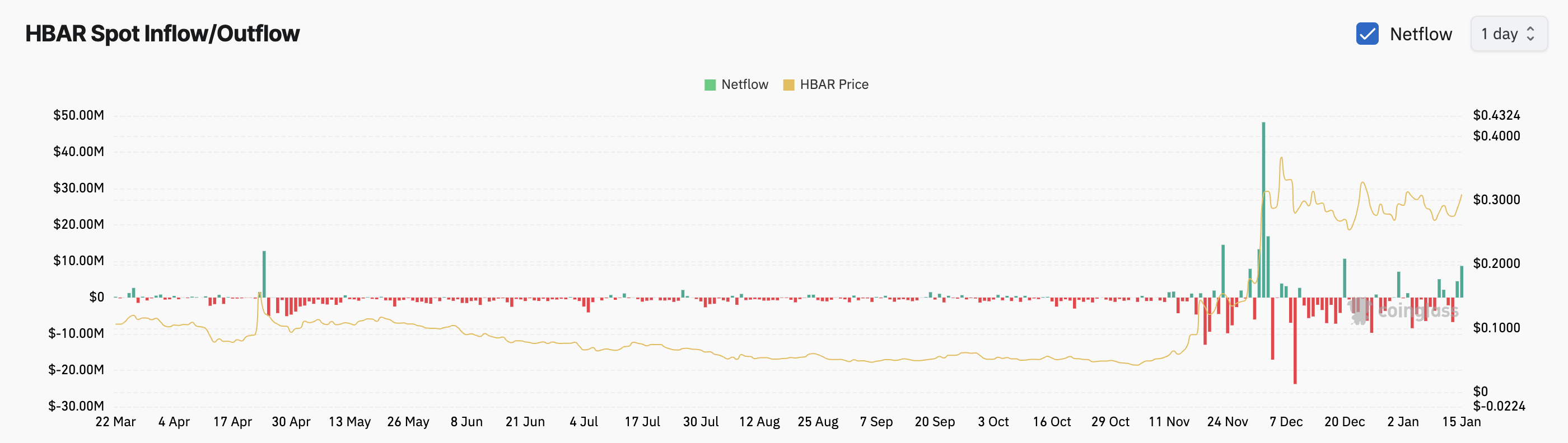 Ang pagtaas ng presyo na ito ay dahil sa pagtaas ng spot inflow ng HBAR, na kasalukuyang nasa pinakamataas mula noong Disyembre 19. Ang tumaas na trading activity ay dahil sa inaasahang pag-upgrade ng Hedera sa mainnet nito sa bersyon 0.57, na naka-schedule mamaya ngayong araw.