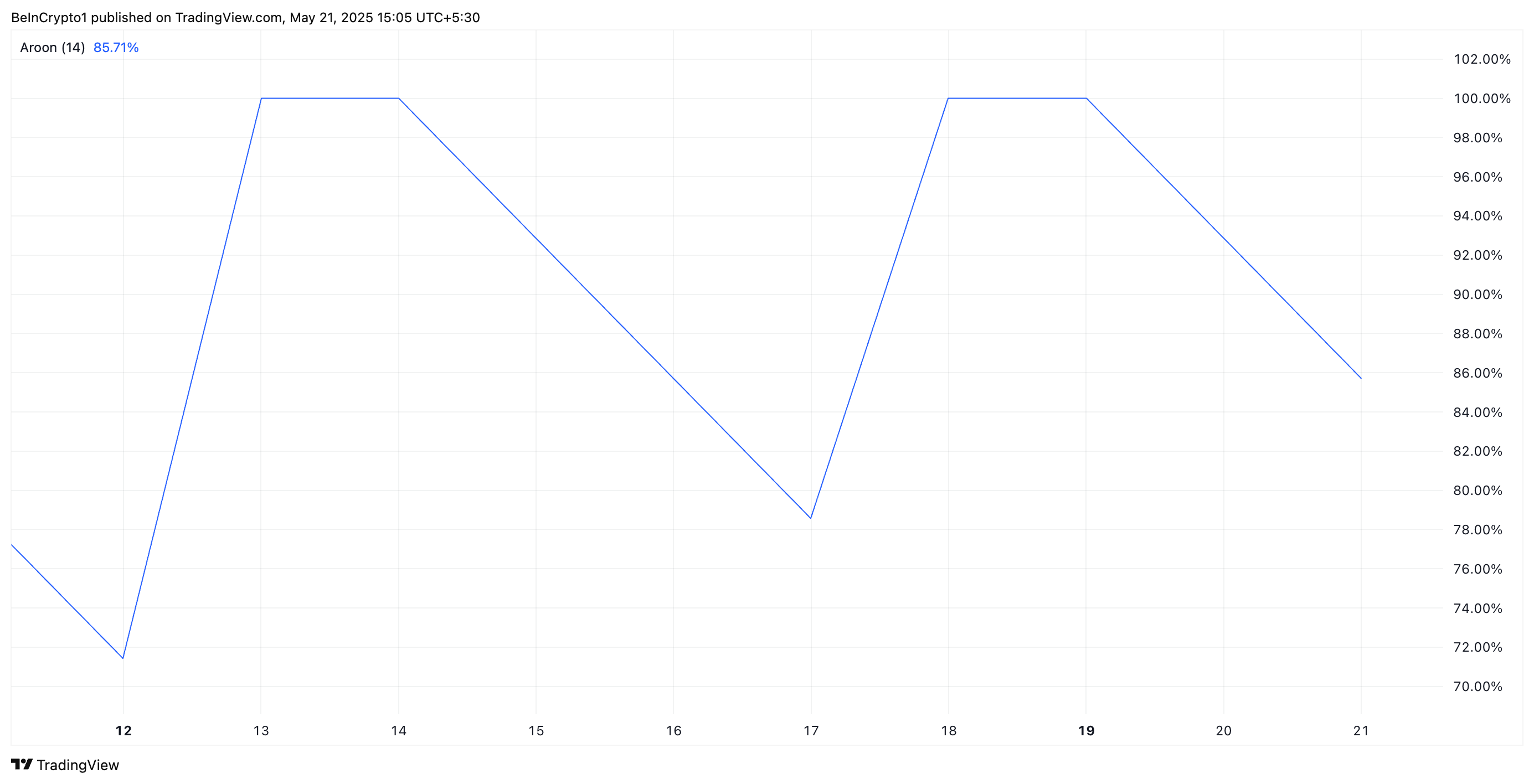 Ang Aroon indicator ay sumusukat sa lakas at direksyon ng trend sa pamamagitan ng pag-track ng oras mula sa pinakamataas na high (Aroon Up) at pinakamababang low (Aroon Down) sa isang set na panahon. Kapag ang Aroon Down line ay malapit sa 100%, ito ay nagpapahiwatig ng bearish momentum at posibleng pagpapatuloy ng downtrend.