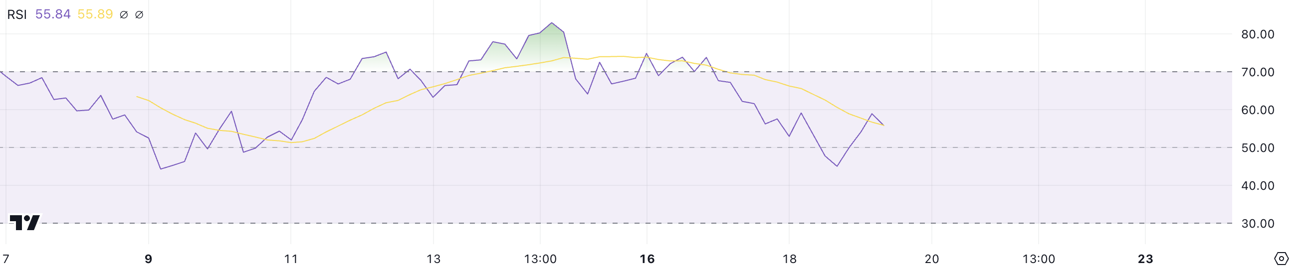 Ang RSI ng HYPE ay kasalukuyang nasa 55.8, mula sa 46 kahapon, na nagpapakita ng notable na recovery sa momentum. Ang pagtaas na ito ay nagsa-suggest na bumabalik ang buying pressure matapos ang recent cooldown para sa perpetuals DEX. Mula Disyembre 13 hanggang Disyembre 15, nang maabot ng HYPE ang bagong all-time high, ang RSI ay nanatiling higit sa 70, na nagpapakita ng overbought conditions.