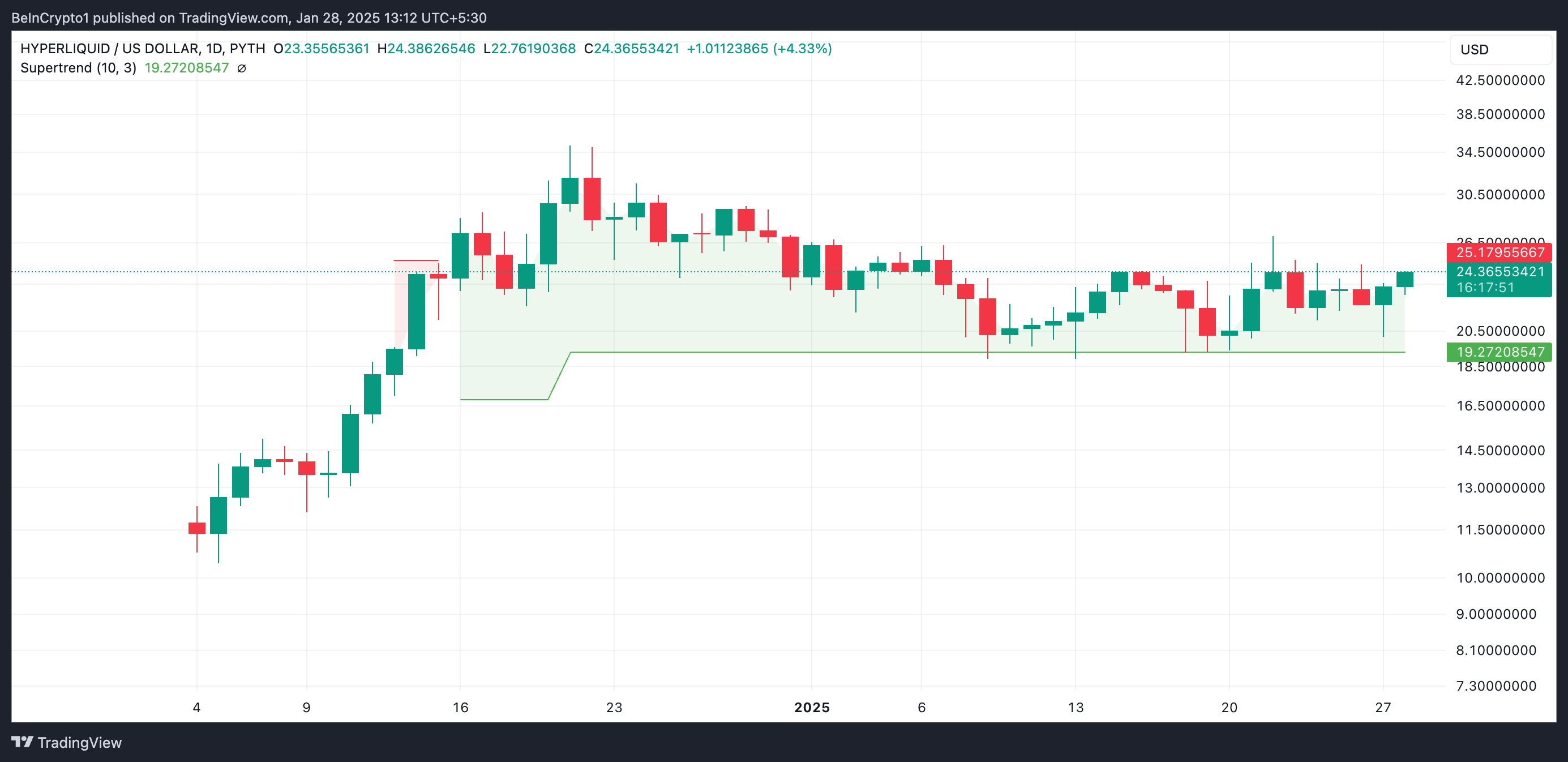Ang pag-assess sa mga key momentum indicator ng HYPE sa daily chart ay nagpapakita ng lumalaking demand para sa altcoin. Halimbawa, sa oras ng pagsulat nito, ang presyo ng HYPE ay nasa itaas ng green line ng Super Trend Indicator nito, na bumubuo ng dynamic support sa $19.27.