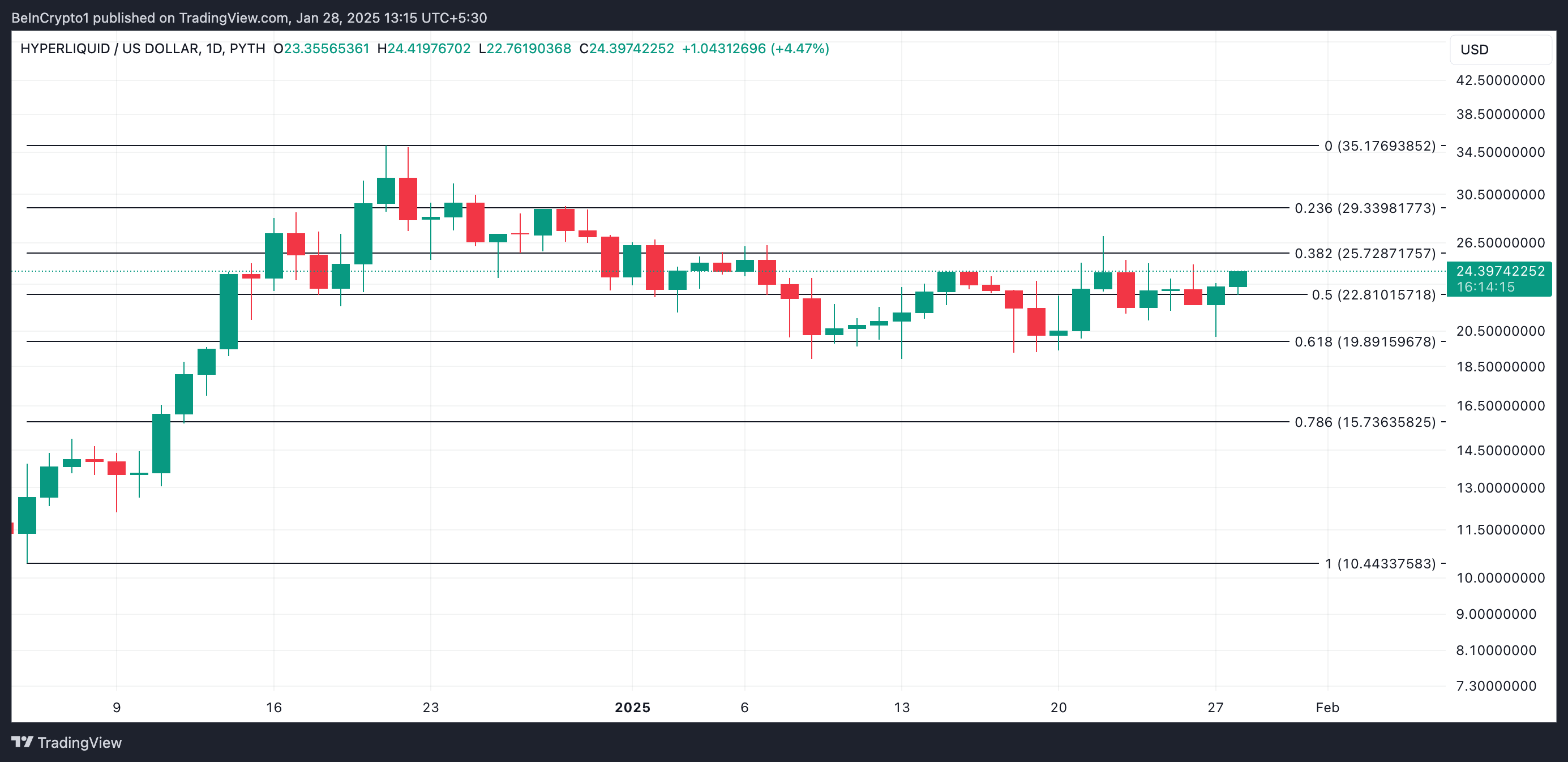 Ang patuloy na uptrend ay magtutulak sa presyo ng HYPE sa itaas ng critical $25 zone. Ang matagumpay na pag-break sa key resistance level na ito ay maaaring magpataas sa presyo ng token lampas sa $29.33 at patungo sa all-time high na $35.17.