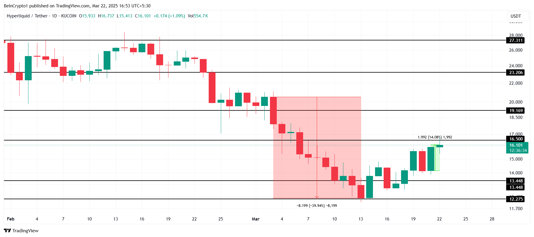 Ang presyo ng HYPE ay kasalukuyang nasa $16.10, tumaas ng 14% sa nakalipas na 24 oras. Ang altcoin ay nasa ilalim lang ng $16.50 resistance level, na nakabawi na ng halos kalahati ng kamakailang 40% na pagbaba. Ang galaw ng presyo na ito ay nagpapakita na may malaking upside potential ang Hyperliquid.