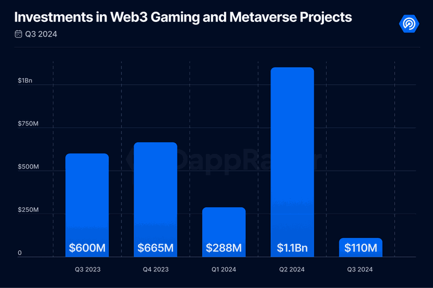 Ayon sa data mula sa Dapp Radar, sa ikalawang quarter ng 2024, ang gaming investments ay umabot sa $1.1 billion, na nagpapakita ng 314% increase mula sa nakaraang quarter. Pero, nagbago ang trend sa sumunod na quarter, kung saan bumagsak ang investments sa $110 million, na nagmarka ng 90% decrease.