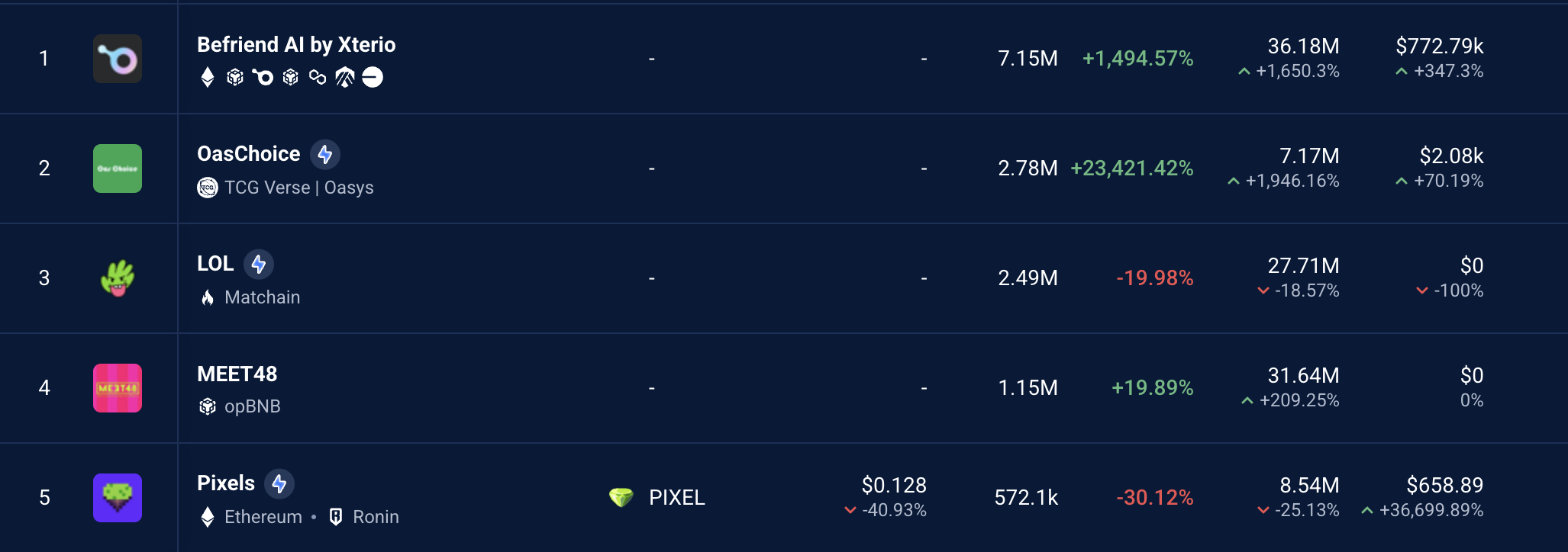 Ayon sa pinakabagong rankings ng DappRadar, nanguna ang Befriend AI ng Xterio, OasChoice, LOL, at MEET48 sa metrics para sa mga pinakapopular na blockchain games sa nakaraang 30 araw.