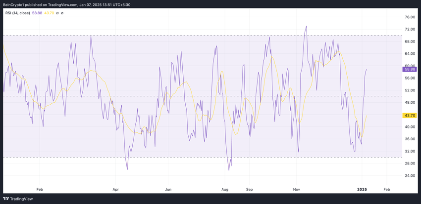 Ang pagtaas ng Relative Strength Index (RSI) ng INJ ay kapansin-pansin dito. Sa kasalukuyan, ang momentum indicator na ito ay nasa uptrend sa 58.88.