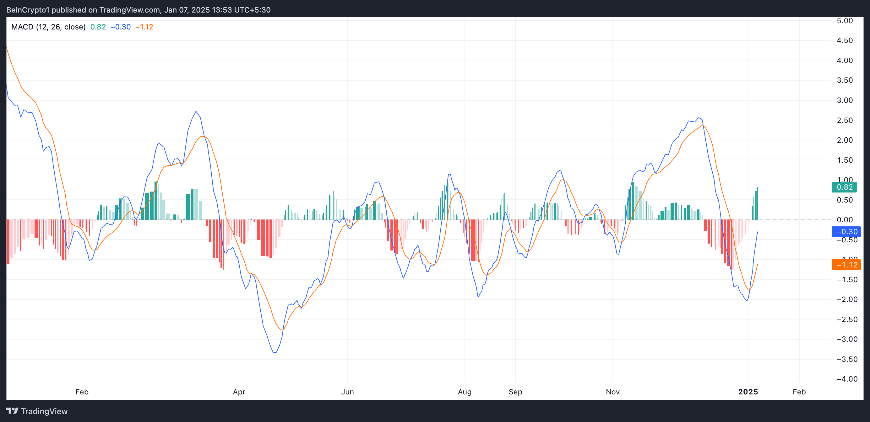 Dagdag pa, ang readings mula sa Moving Average Convergence Divergence (MACD) indicator ng INJ ay sumusuporta sa bullish outlook na ito. Sa kasalukuyan, ang MACD line (blue) ng token ay nasa itaas ng signal line (orange).