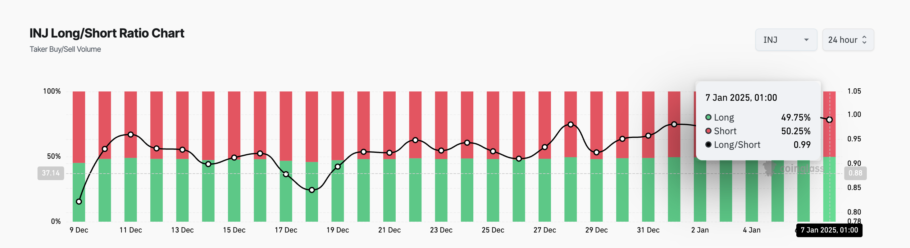 Ang positive na hype sa upgrade na ito ang kasalukuyang nagtutulak sa INJ price rally, na tumaas ng 18% ang value sa nakaraang dalawang araw. Nakakatuwa, kahit ganito, hindi pa rin impressed ang futures traders ng token at patuloy na nagde-demand ng mas maraming short positions. Makikita ito sa Long/Short Ratio ng INJ, na nasa 0.99 sa kasalukuyan.