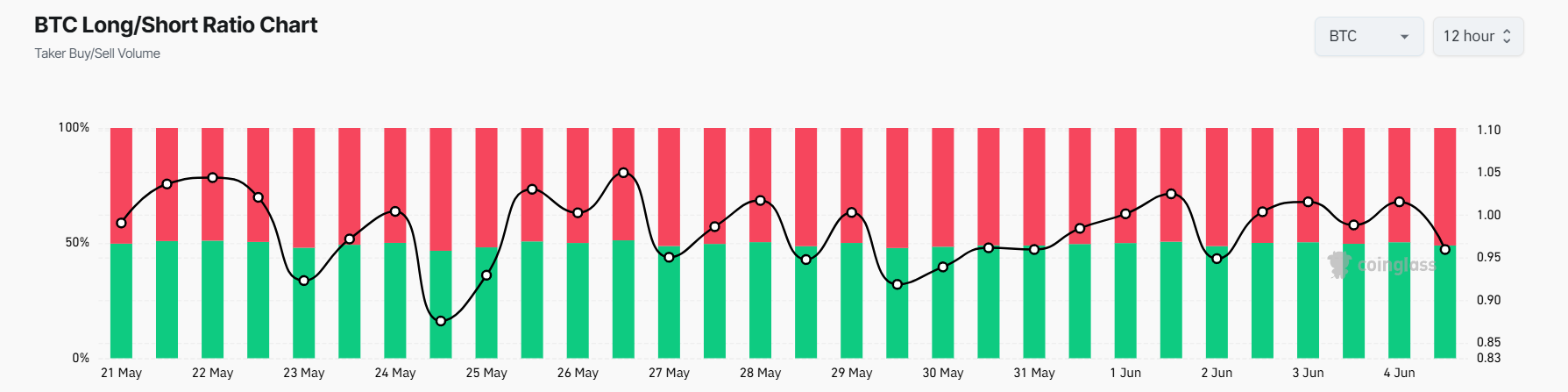 Sa pagtingin sa 12-hour long/short ratio ngayon, makikita na ang shorts ay nasa 51.03% at ang longs ay nasa 48.97%. Kahit na bahagyang mas mataas ang short volume kaysa sa long volume, maliit lang ang pagkakaiba.