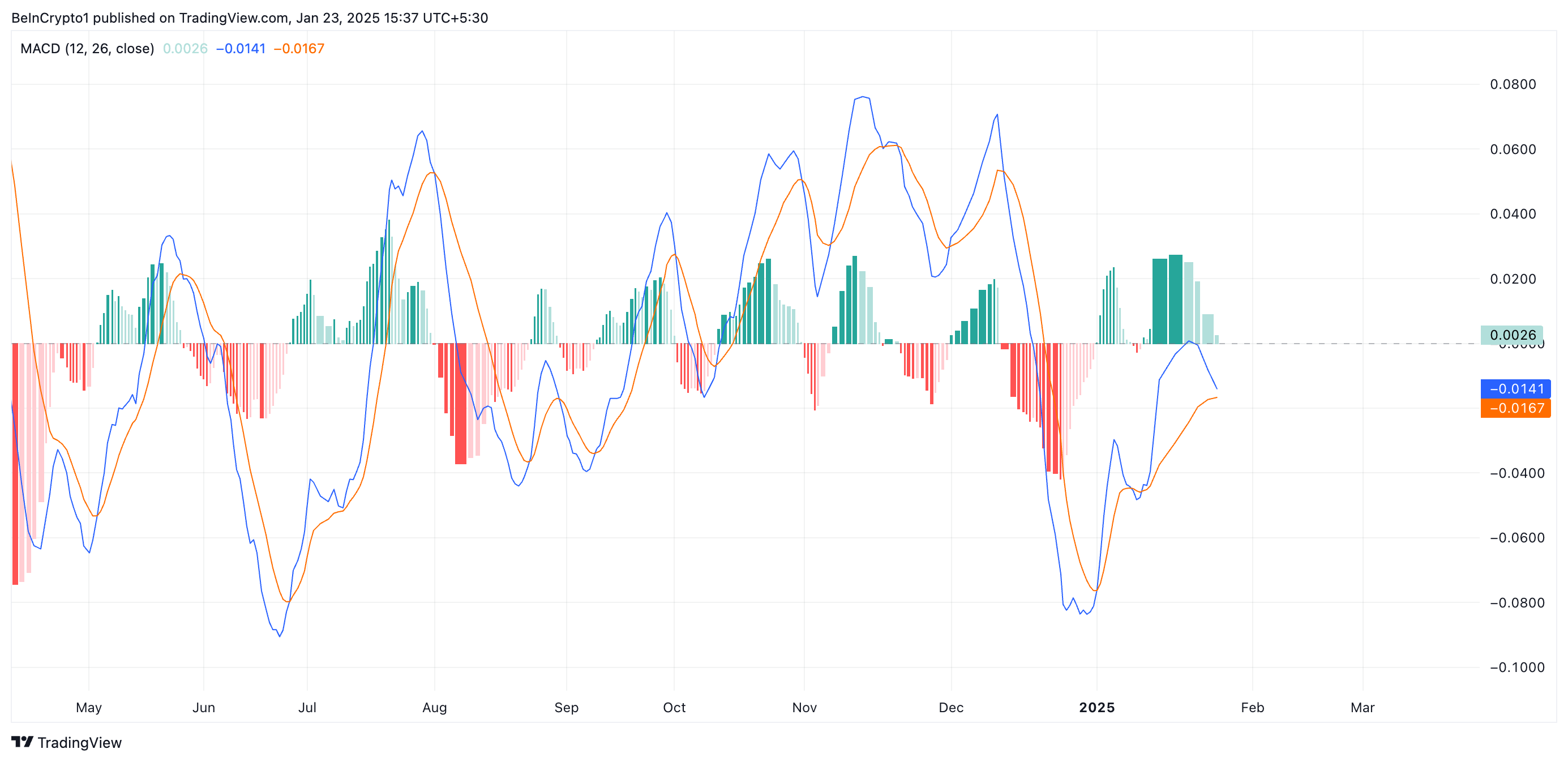 Dagdag pa rito, ang readings mula sa Moving Average Convergence Divergence (MACD) indicator ng JUP ay nagpapakita ng tumataas na selling pressure. Sa oras ng pagbalita, ang signal line ng token (orange) ay nakatakdang mag-break sa ibabaw ng MACD line nito (blue).